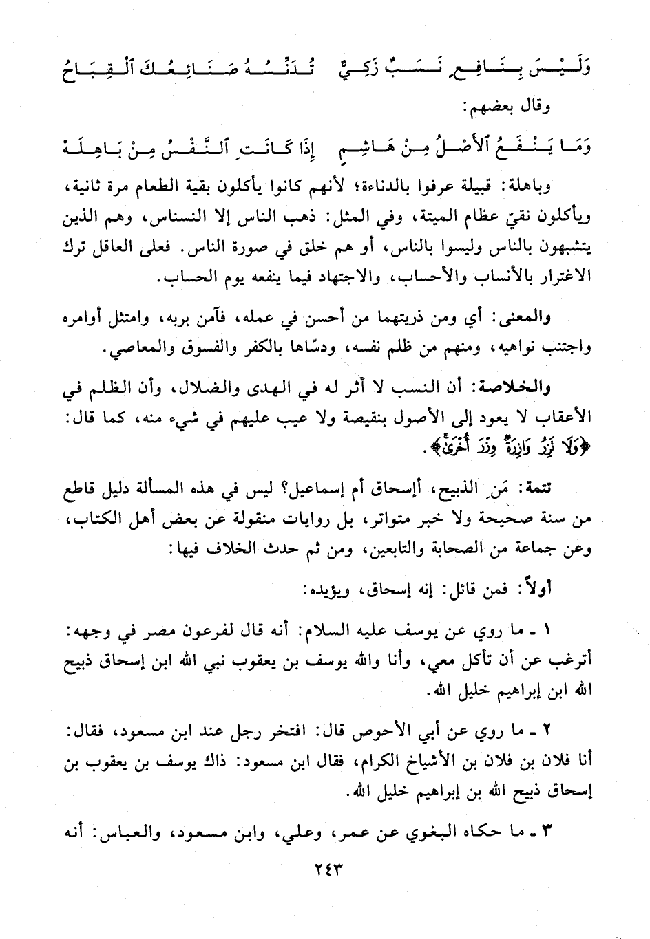 تتمة: مَنِ الذبيح، أإسحاق أم إسماعيل؟ ليس في هذه المسألة دليل قاطع من سنة صحيحة ولا خبر متواتر، بل روايات منقولة عن بعض أهل الكتاب، وعن جماعة من الصحابة والتابعين، ومن ثم حدث الخلاف فيها: