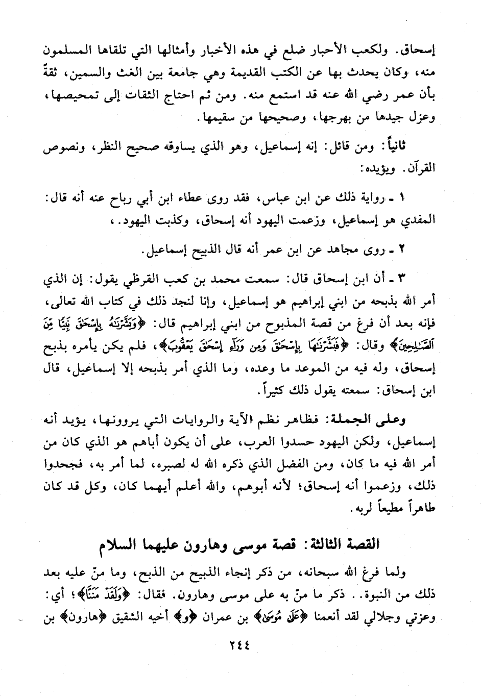 3 - أن ابن إسحاق قال: سمعت محمد بن كعب القرظي يقول: إن الذي أمر الله بذبحه من ابني إبراهيم هو إسماعيل، وإنا لنجد ذلك في كتاب الله تعالى، فإنه بعد أن فرغ من قصة المذبوح من ابني إبراهيم قال: {وَبَشَّرْناهُ بِإِسْحاقَ نَبِيًّا مِنَ الصَّالِحِينَ} وقال: {فَبَشَّرْناها بِإِسْحاقَ وَمِنْ وَراءِ إِسْحاقَ يَعْقُوبَ}، فلم يكن يأمره بذبح إسحاق، وله فيه من الموعد ما وعده، وما الذي أمر بذبحه إلا إسماعيل، قال ابن إسحاق: سمعته يقول ذلك كثيرًا.