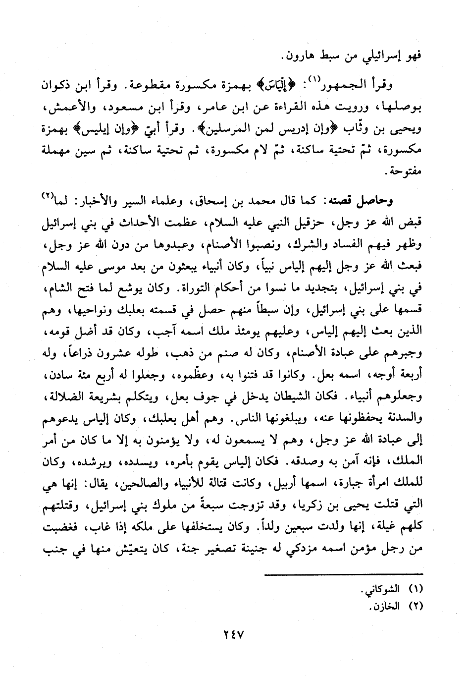 وحاصل قصته: كما قال محمد بن إسحاق، وعلماء السير والأخبار: لما (¬2) قبض الله عز وجل، حزقيل النبي عليه السلام، عظمت الأحداث في بني إسرائيل وظهر فيهم الفساد والشرك، ونصبوا الأصنام، وعبدوها من دون الله عز وجل، فبعث الله عز وجل إليهم إلياس نبيا، وكان أنبياء يبعثون من بعد موسى عليه السلام في بني إسرائيل، بتجديد ما نسوا من أحكام التوراة. وكان يوشع لما فتح الشام، قسمها على بني إسرائيل، وإن سبطا منهم حصل في قسمته بعلبك ونواحيها، وهم الذين بعث إليهم إلياس، وعليهم يومئذ ملك اسمه آجب، وكان قد أضل قومه، وجبرهم على عبادة الأصنام، وكان له صنم من ذهب، طوله عشرون ذراعًا، وله أربعة أوجه، اسمه بعل. وكانوا قد فتنوا به، وعظّموه، وجعلوا له أربع مئة سادن، وجعلوهم أنبياء. فكان الشيطان يدخل في جوف بعل، ويتكلم بشريعة الضلالة، والسدنة يحفظونها عنه، ويبلغونها الناس. وهم أهل بعلبك، وكان إلياس يدعوهم إلى عبادة الله عز وجل، وهم لا يسمعون له، ولا يؤمنون به إلا ما كان من أمر الملك، فإنه آمن به وصدقه. فكان إلياس يقوم بأمره، ويسدده، ويرشده، وكان للملك امرأة جبارة، اسمها أربيل، وكانت قتالة للأنبياء والصالحين، يقال: إنها هي التي قتلت يحيى بن زكريا، وقد تزوجت سبعةً من ملوك بني إسرائيل، وقتلتهم كلهم غيلة، إنها ولدت سبعين ولدًا. وكان يستخلفها على ملكه إذا غاب، فغضبت من رجل مؤمن اسمه مزدكي له جنينة تصغير جنة، كان يتعيّش منها في جنب