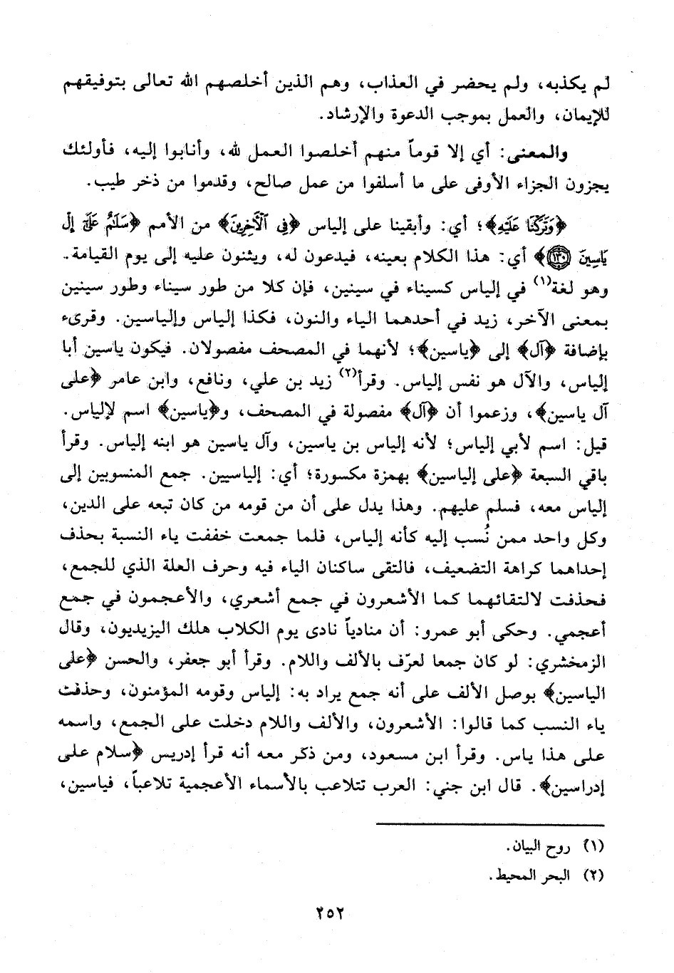 130 - {سَلامٌ عَلى إِلْ ياسِينَ (130)} أي: هذا الكلام بعينه، فيدعون له، ويثنون عليه إلى يوم القيامة. وهو لغة (¬1) في إلياس كسيناء في سينين، فإن كلا من طور سيناء وطور سينين بمعنى الآخر، زيد في أحدهما الياء والنون، فكذا إلياس وإلياسين. وقرىء بإضافة {آل} إلى {ياسين}؛ لأنهما في المصحف مفصولان. فيكون ياسين أبا إلياس، والآل هو نفس إلياس. وقرأ (¬2) زيد بن علي، ونافع، وابن عامر {على إل ياسين}، وزعموا أن {آل} مفصولة في المصحف، و {ياسين} اسم لإلياس. قيل: اسم لأبي إلياس؛ لأنه إلياس بن ياسين، وآل ياسين هو ابنه إلياس. وقرأ باقي السبعة {على إلياسين} بهمزة مكسورة؛ أي: إلياسيين. جمع المنسوبين إلى إلياس معه، فسلم عليهم. وهذا يدل على أن من قومه من كان تبعه على الدين، وكل واحد ممن نسب إليه كأنه إلياس، فلما جمعت خففت ياء النسبة بحذف إحداهما كراهة التضعيف، فالتقى ساكنان الياء فيه وحرف العلة الذي للجمع، فحذفت لالتقائهما كما الأشعرون في جمع أشعري، والأعجمون في جمع أعجمي. وحكى أبو عمرو: أن مناديًا نادى يوم الكلاب هلك اليزيديون، وقال الزمخشري: لو كان جمعا لعرّف بالألف واللام. وقرأ أبو جعفر، والحسن {على الياسين} بوصل الألف على أنه جمع يراد به: إلياس وقومه المؤمنون، وحذفت ياء النسب كما قالوا: الأشعرون، والألف واللام دخلت على الجمع، واسمه على هذا ياس. وقرأ ابن مسعود، ومن ذكر معه أنه قرأ إدريس {سلام على إدراسين}. قال ابن جني: العرب تتلاعب بالأسماء الأعجمية تلاعبًا، فياسين،