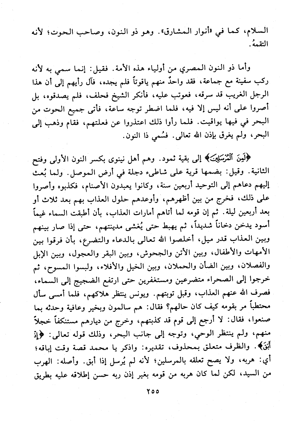 وأما ذو النون المصري من أولياء هذه الأمة. فقيل: إنما سمي به لأنه ركب سفينة مع جماعة، فقد واحدٌ منهم ياقوتًا فلم يجده، فآل رأيهم إلى أن هذا الرجل الغريب قد سرقه، فعوتب عليه، فأنكر الشيخ فحلف، فلم يصدقوه، بل أصروا على أنه ليس إلا فيه، فلما اضطر توجه ساعة، فأتى جميع الحوت من البحر في فيها يواقيت. فلما رأوا ذلك اعتذروا عن فعلتهم، فقام وذهب إلى البحر، ولم يغرق بإذن الله تعالى. فسمي ذا النون.