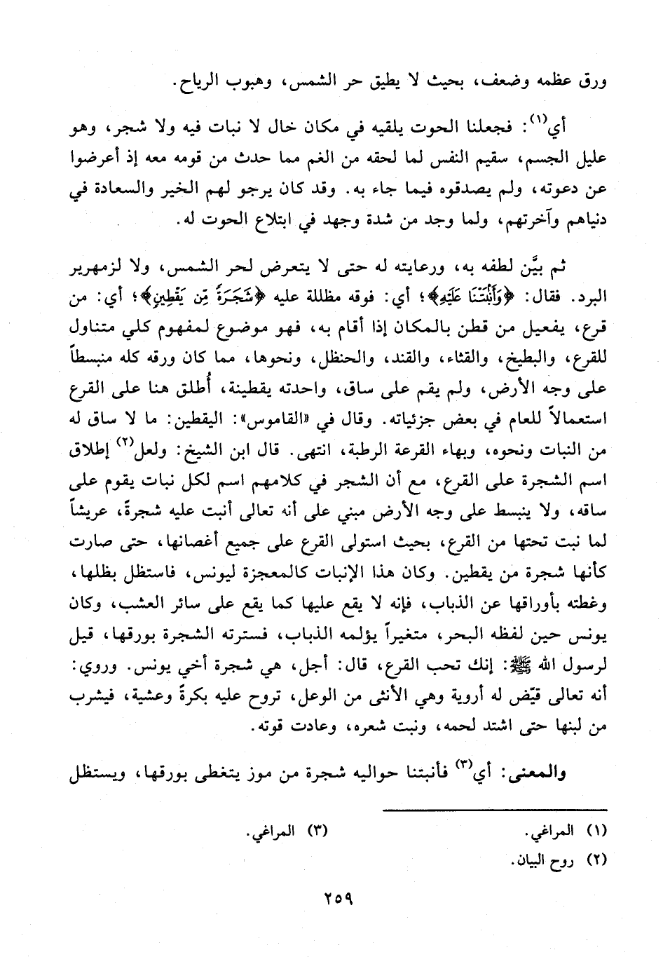 146 - ثم بيّن لطفه به، ورعايته له حتى لا يتعرض لحر الشمس، ولا لزمهرير البرد. فقال: {وَأَنْبَتْنا عَلَيْهِ}؛ أي: فوقه مظللة عليه {شَجَرَةً مِنْ يَقْطِينٍ}؛ أي: من قرع، يفعيل من قطن بالمكان إذا أقام به، فهو موضوع لمفهوم كلي متناول للقرع، والبطيخ، والقثاء، والقند، والحنظل، ونحوها، مما كان ورقه كله منبسطًا على وجه الأرض، ولم يقم على ساق، واحدته يقطينة، أطلق هنا على القرع استعمالًا للعام في بعض جزئياته. وقال في «القاموس»: اليقطين: ما لا ساق له من النبات ونحوه، وبهاء القرعة الرطبة، انتهى. قال ابن الشيخ: ولعل (¬2) إطلاق اسم الشجرة على القرع، مع أن الشجر في كلامهم اسم لكل نبات يقوم على ساقه، ولا ينبسط على وجه الأرض مبني على أنه تعالى أنبت عليه شجرةً، عريشًا لما نبت تحتها من القرع، بحيث استولى القرع على جميع أغصانها، حتى صارت كأنها شجرة من يقطين. وكان هذا الإنبات كالمعجزة ليونس، فاستظل بظلها، وغطته بأوراقها عن الذباب، فإنه لا يقع عليها كما يقع على سائر العشب، وكان يونس حين لفظه البحر، متغيرًا يؤلمه الذباب، فسترته الشجرة بورقها، قيل لرسول الله - صلى الله عليه وسلم -: إنك تحب القرع، قال: أجل، هي شجرة أخي يونس. وروي: أنه تعالى قيّض له أروية وهي الأنثى من الوعل، تروح عليه بكرةً وعشية، فيشرب من لبنها حتى اشتد لحمه، ونبت شعره، وعادت قوته.