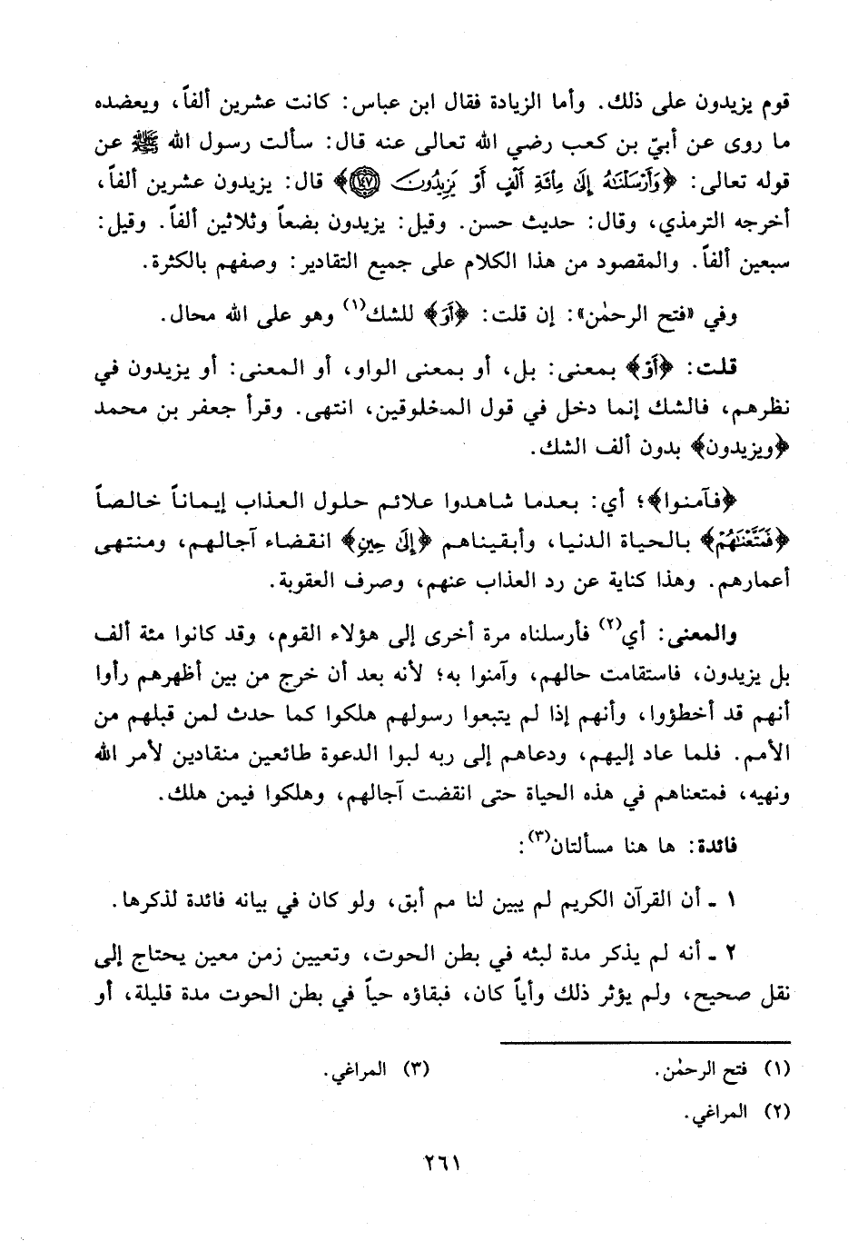 قوم يزيدون على ذلك. وأما الزيادة فقال ابن عباس: كانت عشرين ألفًا، ويعضده ما روى عن أبيّ بن كعب رضي الله تعالى عنه قال: سألت رسول الله - صلى الله عليه وسلم - عن قوله تعالى: {وَأَرْسَلْناهُ إِلى مِائَةِ أَلْفٍ أَوْ يَزِيدُونَ (147)} قال: يزيدون عشرين ألفًا، أخرجه الترمذي، وقال: حديث حسن. وقيل: يزيدون بعضًا وثلاثين ألفًا. وقيل: سبعين ألفًا. والمقصود من هذا الكلام على جميع التقادير: وصفهم بالكثرة.