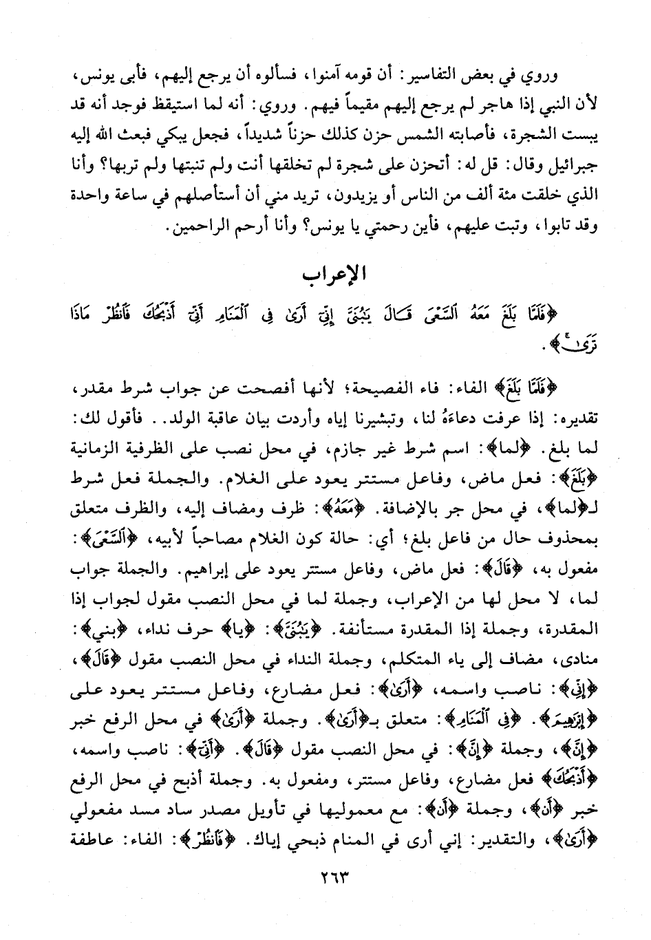 {فَلَمَّا بَلَغَ} الفاء: فاء الفصيحة؛ لأنها أفصحت عن جواب شرط مقدر، تقديره: إذا عرفت دعاءَهُ لنا، وتبشيرنا إياه وأردت بيان عاقبة الولد .. فأقول لك: لما بلغ. {لما}: اسم شرط غير جازم، في محل نصب على الظرفية الزمانية {بَلَغَ}: فعل ماض، وفاعل مستتر يعود على الغلام. والجملة فعل شرط لـ {لما}، في محل جر بالإضافة. {مَعَهُ}: ظرف ومضاف إليه، والظرف متعلق بمحذوف حال من فاعل بلغ؛ أي: حالة كون الغلام مصاحبًا لأبيه، {السَّعْيَ}: مفعول به، {قالَ}: فعل ماض، وفاعل مستتر يعود على إبراهيم. والجملة جواب لما، لا محل لها من الإعراب، وجملة لما في محل النصب مقول لجواب إذا المقدرة، وجملة إذا المقدرة مستأنفة. {يا بُنَيَّ}: {يا} حرف نداء، {بُنَيَّ}: منادى، مضاف إلى ياء المتكلم، وجملة النداء في محل النصب مقول {قالَ}، {إِنِّي}: ناصب واسمه، {أَرى}: فعل مضارع، وفاعل مستتر يعود على {إبراهيم}. {فِي الْمَنامِ}: متعلق بـ {أَرى}. وجملة {أَرى} في محل الرفع خبر {إِنْ}، وجملة {إِنْ}: في محل النصب مقول {قالَ}. {إِنِّي}: ناصب واسمه، {أَذْبَحُكَ} فعل مضارع، وفاعل مستتر، ومفعول به. وجملة أذبح في محل الرفع خبر {أن}، وجملة {أن}: مع معموليها في تأويل مصدر ساد مسد مفعولي {أَرى}، والتقدير: إني أرى في المنام ذبحي إياك. {فَانْظُرْ}: الفاء: عاطفة