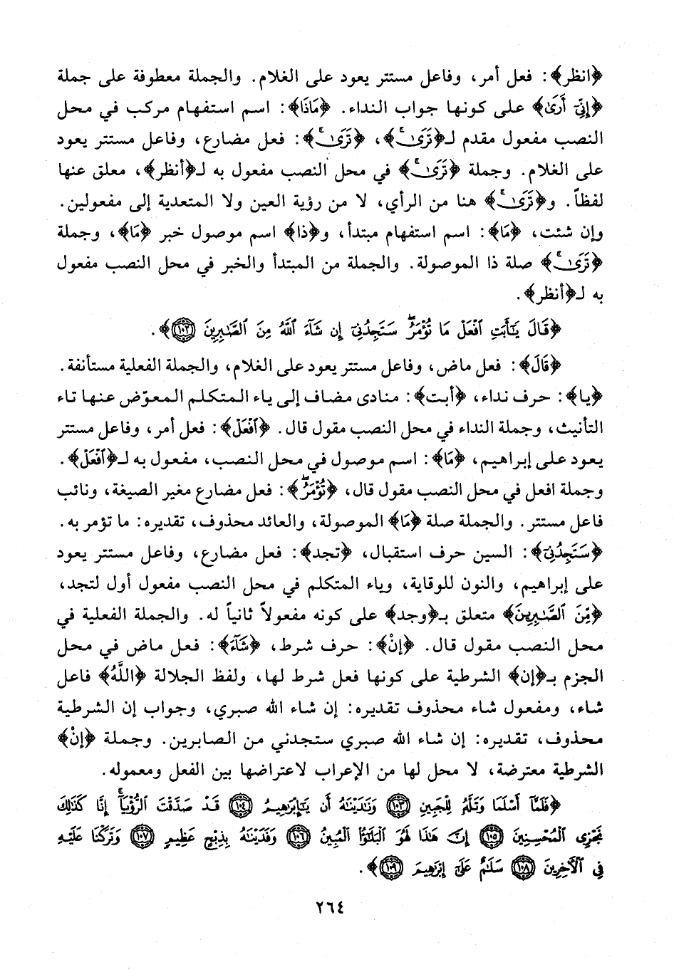 {قالَ}: فعل ماض، وفاعل مستتر يعود على الغلام، والجملة الفعلية مستأنفة. {يا}: حرف نداء، {أَبَتِ}: منادى مضاف إلى ياء المتكلم المعوّض عنها تاء التأنيث، وجملة النداء في محل النصب مقول قال. {افْعَلْ}: فعل أمر، وفاعل مستتر يعود على إبراهيم، {ما}: اسم موصول في محل النصب، مفعول به لـ {افْعَلْ}. وجملة افعل في محل النصب مقول قال، {تُؤْمَرُ}: فعل مضارع مغير الصيغة، ونائب فاعل مستتر. والجملة صلة {ما} الموصولة، والعائد محذوف، تقديره: ما تؤمر به. {سَتَجِدُنِي}: السين حرف استقبال، {تجد}: فعل مضارع، وفاعل مستتر يعود على إبراهيم، والنون للوقاية، وياء المتكلم في محل النصب مفعول أول لتجد، {مِنَ الصَّابِرِينَ} متعلق بـ {وجد} على كونه مفعولًا ثانيًا له. والجملة الفعلية في محل النصب مقول قال. {إِنْ}: حرف شرط، {شاءَ}: فعل ماض في محل الجزم بـ {إِنْ} الشرطية على كونها فعل شرط لها، ولفظ الجلالة {اللَّهُ} فاعل شاء، ومفعول شاء محذوف تقديره: إن شاء الله صبري، وجواب {إن} الشرطية محذوف، تقديره: إن شاء الله صبري ستجدني من الصابرين. وجملة {إِنْ} الشرطية معترضة، لا محل لها من الإعراب لاعتراضها بين الفعل ومعموله.