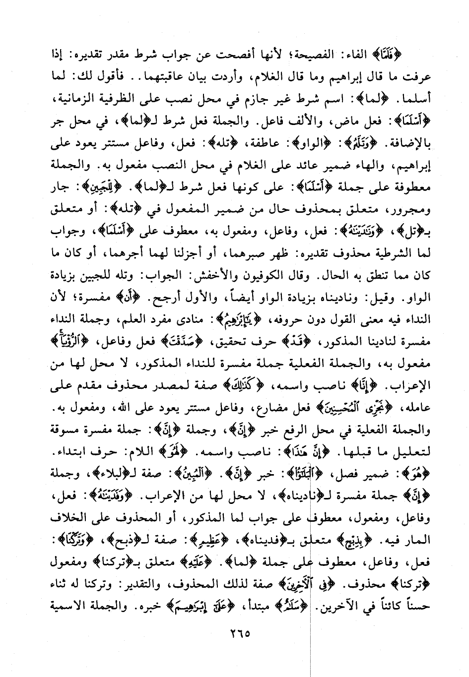 {فَلَمَّا} الفاء: الفصيحة؛ لأنها أفصحت عن جواب شرط مقدر تقديره: إذا عرفت ما قال إبراهيم وما قال الغلام، وأردت بيان عاقبتهما .. فأقول لك: لما أسلما. {لما}: اسم شرط غير جازم في محل نصب على الظرفية الزمانية، {أَسْلَما}: فعل ماض، والألف فاعل. والجملة فعل شرط لـ {لما}، في محل جر بالإضافة. {وَتَلَّهُ}: {الواو}: عاطفة، {تَلَّهُ}: فعل، وفاعل مستتر يعود على إبراهيم، والهاء ضمير عائد على الغلام في محل النصب مفعول به. والجملة معطوفة على جملة {أَسْلَما}: على كونها فعل شرط لـ {لما}. {لِلْجَبِينِ}: جار ومجرور، متعلق بمحذوف حال من ضمير المفعول في {تَلَّهُ}: أو متعلق بـ {تل}، {وَنادَيْناهُ}: فعل، وفاعل، ومفعول به، معطوف على {أَسْلَما}، وجواب لما الشرطية محذوف تقديره: ظهر صبرهما، أو أجزلنا لهما أجرهما، أو كان ما كان مما تنطق به الحال. وقال الكوفيون والأخفش: الجواب: وتله للجبين بزيادة الواو. وقيل: وناديناه بزيادة الواو أيضًا، والأول أرجح. {أَنْ} مفسرة؛ لأن النداء فيه معنى القول دون حروفه، {يا إِبْراهِيمُ}: منادى مفرد العلم، وجملة النداء مفسرة لنادينا المذكور، {قَدْ} حرف تحقيق، {صَدَّقْتَ} فعل وفاعل، {الرُّؤْيا} مفعول به، والجملة الفعلية جملة مفسرة للنداء المذكور، لا محل لها من الإعراب. {إِنَّا} ناصب واسمه، {كَذلِكَ} صفة لمصدر محذوف مقدم على عامله، {نَجْزِي الْمُحْسِنِينَ} فعل مضارع، وفاعل مستتر يعود على الله، ومفعول به. والجملة الفعلية في محل الرفع خبر {إن}، وجملة {إن}: جملة مفسرة مسوقة لتعليل ما قبلها. {إِنَّ هذا}: ناصب واسمه. {لَهُوَ} اللام: حرف ابتداء. {هو}: ضمير فصل، {الْبَلاءُ}: خبر {إِنَّ}. {الْمُبِينُ}: صفة لـ {لبلاء}، وجملة {إِنَّ} جملة مفسرة لـ {نادَيْناهُ}، لا محل لها من الإعراب. {وَفَدَيْناهُ}: فعل، وفاعل، ومفعول، معطوف على جواب لما المذكور، أو المحذوف على الخلاف المار فيه. {بِذِبْحٍ} متعلق بـ {فَدَيْناهُ}، {عَظِيمٍ}: صفة لـ {ذبح}، {وَتَرَكْنا} فعل، وفاعل، معطوف على جملة {لما}. {عَلَيْهِ} متعلق بـ {تَرَكْنا} ومفعول {تَرَكْنا} محذوف. {فِي الْآخِرِينَ} صفة لذلك المحذوف، والتقدير: وتركنا له ثناء حسنًا كائنًا في الآخرين. {سَلامٌ} مبتدأ، {عَلى إِبْراهِيمَ} خبره. والجملة الاسمية