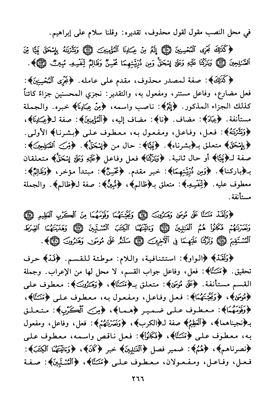 {وَلَقَدْ} {الواو}: استئنافية، واللام: موطئة للقسم. {قد} حرف تحقيق. {مَنَنَّا}: فعل، وفاعل جواب القسم، لا محل لها من الإعراب. وجملة القسم مستأنفة. {عَلى مُوسى}: متعلق بـ {مَنَنَّا}، {وَهارُونَ}: معطوف على {مُوسى}، {وَنَجَّيْناهُما}: فعل وفاعل، ومفعول به، معطوف على {مَنَنَّا}، {وَقَوْمَهُما} معطوف على ضمير {هما}، {مِنَ الْكَرْبِ}: متعلق بـ {نَجَّيْناهُما}، {الْعَظِيمِ} صفة لـ {الْكَرْبِ}، {وَنَصَرْناهُمْ}: فعل، وفاعل، ومفعول به، معطوف على {مَنَنَّا}، {فَكانُوا}: فعل ناقص واسمه، معطوف على {نَصَرْناهُمْ}، {هُمُ}: ضمير فصل {الْغالِبِينَ} خبر {كان}، {وَآتَيْناهُمَا الْكِتابَ}: فعل، وفاعل، ومفعولان، معطوف على {مَنَنَّا}، {الْمُسْتَبِينَ}: صفة