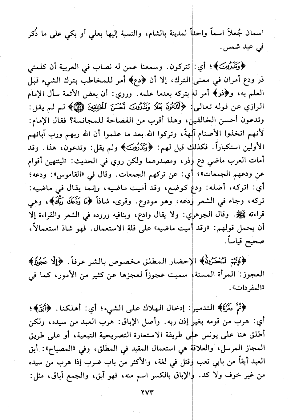 {وَتَذَرُونَ}؛ أي: تتركون. وسمعنا عمن له نصاب في العربية أن كلمتي ذر ودع أمران في معنى الترك، إلا أن {دع} أمر للمخاطب بترك الشيء قبل العلم به، و {ذر} أمر له بتركه بعدما علمه. وروي: أن بعض الأئمة سأل الإمام الرازي عن قوله تعالى: {أَتَدْعُونَ بَعْلًا وَتَذَرُونَ أَحْسَنَ الْخالِقِينَ (125)} لم لم يقل: وتدعون أحسن الخالقين، وهذا أقرب من الفصاحة للمجانسة؟ فقال الإمام: لأنهم اتخذوا الأصنام آلهةً، وتركوا الله بعد ما علموا أن الله ربهم ورب آبائهم الأولين استكبارًا. فكذلك قيل لهم: {وَتَذَرُونَ} ولم يقل: وتدعون، هذا. وقد أمات العرب ماضي دع وذر، ومصدرهما ولكن روي في الحديث: «لينتهين أقوام عن ودعهم الجمعات»؛ أي: عن تركهم الجمعات. وقال في «القاموس»: ودعه؛ أي: اتركه، أصله: ودع كوضع، وقد أميت ماضيه، وإنما يقال في ماضيه: تركه، وجاء في الشعر ودعه، وهو مودوع. وقرىء شاذًا {ما وَدَّعَكَ رَبُّكَ}، وهي قراءته - صلى الله عليه وسلم -. وقال الجوهري: ولا يقال وادع، وينافيه وروده في الشعر والقراءة إلا أن يحمل قولهم: «وقد أميت ماضيه» على قلة الاستعمال. فهو شاذ استعمالًا، صحيح قياسًا.