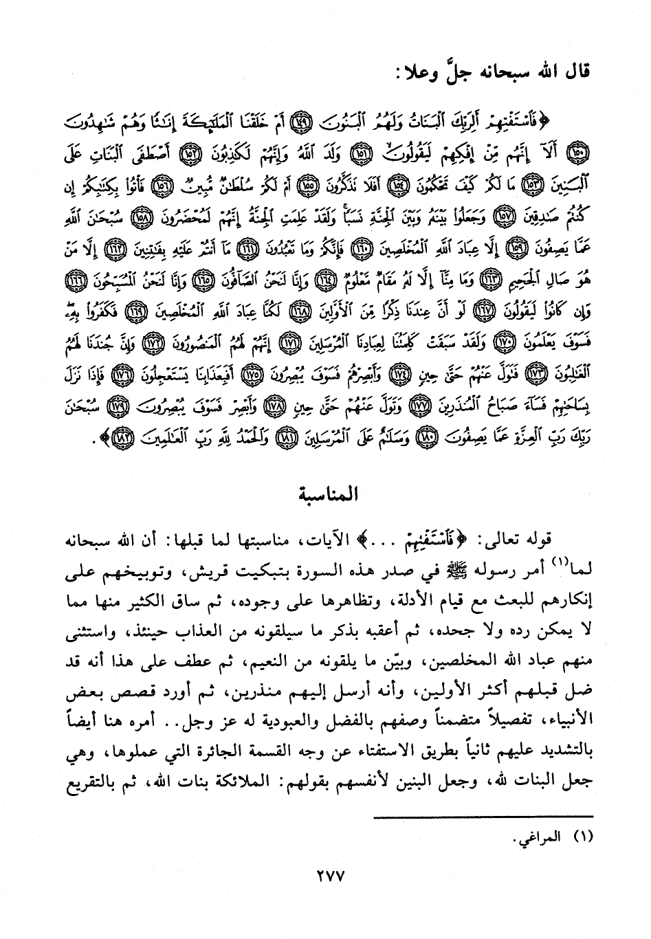 {فَاسْتَفْتِهِمْ أَلِرَبِّكَ الْبَنَاتُ وَلَهُمُ الْبَنُونَ (149) أَمْ خَلَقْنَا الْمَلَائِكَةَ إِنَاثًا وَهُمْ شَاهِدُونَ (150) أَلَا إِنَّهُمْ مِنْ إِفْكِهِمْ لَيَقُولُونَ (151) وَلَدَ اللَّهُ وَإِنَّهُمْ لَكَاذِبُونَ (152) أَصْطَفَى الْبَنَاتِ عَلَى الْبَنِينَ (153) مَا لَكُمْ كَيْفَ تَحْكُمُونَ (154) أَفَلَا تَذَكَّرُونَ (155) أَمْ لَكُمْ سُلْطَانٌ مُبِينٌ (156) فَأْتُوا بِكِتَابِكُمْ إِنْ كُنْتُمْ صَادِقِينَ (157) وَجَعَلُوا بَيْنَهُ وَبَيْنَ الْجِنَّةِ نَسَبًا وَلَقَدْ عَلِمَتِ الْجِنَّةُ إِنَّهُمْ لَمُحْضَرُونَ (158) سُبْحَانَ اللَّهِ عَمَّا يَصِفُونَ (159) إِلَّا عِبَادَ اللَّهِ الْمُخْلَصِينَ (160) فَإِنَّكُمْ وَمَا تَعْبُدُونَ (161) مَا أَنْتُمْ عَلَيْهِ بِفَاتِنِينَ (162) إِلَّا مَنْ هُوَ صَالِ الْجَحِيمِ (163) وَمَا مِنَّا إِلَّا لَهُ مَقَامٌ مَعْلُومٌ (164) وَإِنَّا لَنَحْنُ الصَّافُّونَ (165) وَإِنَّا لَنَحْنُ الْمُسَبِّحُونَ (166) وَإِنْ كَانُوا لَيَقُولُونَ (167) لَوْ أَنَّ عِنْدَنَا ذِكْرًا مِنَ الْأَوَّلِينَ (168) لَكُنَّا عِبَادَ اللَّهِ الْمُخْلَصِينَ (169) فَكَفَرُوا بِهِ فَسَوْفَ يَعْلَمُونَ (170) وَلَقَدْ سَبَقَتْ كَلِمَتُنَا لِعِبَادِنَا الْمُرْسَلِينَ (171) إِنَّهُمْ لَهُمُ الْمَنْصُورُونَ (172) وَإِنَّ جُنْدَنَا لَهُمُ الْغَالِبُونَ (173) فَتَوَلَّ عَنْهُمْ حَتَّى حِينٍ (174) وَأَبْصِرْهُمْ فَسَوْفَ يُبْصِرُونَ (175) أَفَبِعَذَابِنَا يَسْتَعْجِلُونَ (176) فَإِذَا نَزَلَ بِسَاحَتِهِمْ فَسَاءَ صَبَاحُ الْمُنْذَرِينَ (177) وَتَوَلَّ عَنْهُمْ حَتَّى حِينٍ (178) وَأَبْصِرْ فَسَوْفَ يُبْصِرُونَ (179) سُبْحَانَ رَبِّكَ رَبِّ الْعِزَّةِ عَمَّا يَصِفُونَ (180) وَسَلَامٌ عَلَى الْمُرْسَلِينَ (181) وَالْحَمْدُ لِلَّهِ رَبِّ الْعَالَمِينَ (182)}.