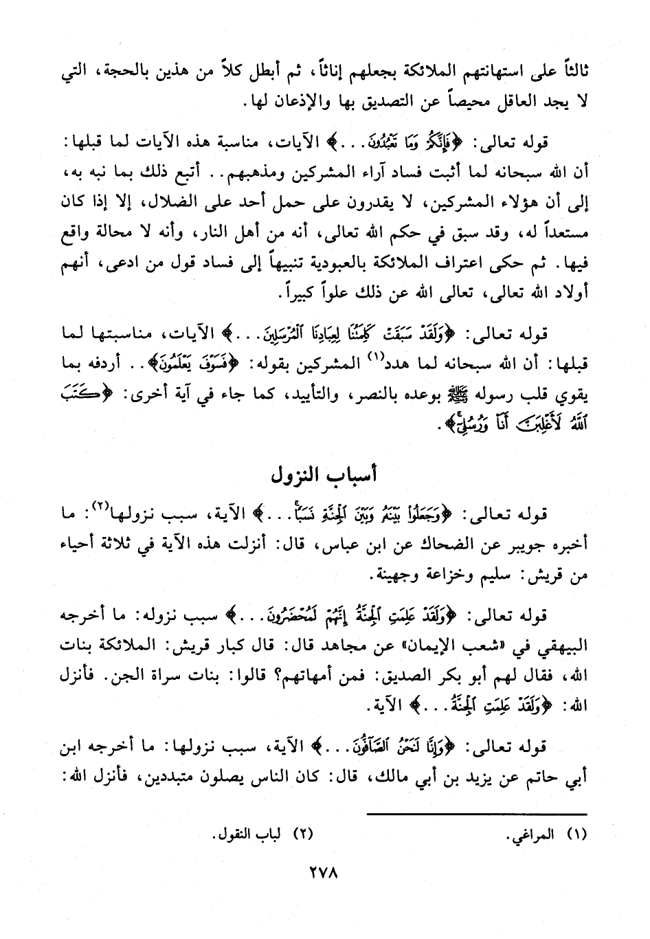 قوله تعالى: {وَلَقَدْ عَلِمَتِ الْجِنَّةُ إِنَّهُمْ لَمُحْضَرُونَ ...} سبب نزوله: ما أخرجه البيهقي في «شعب الإيمان» عن مجاهد قال: قال كبار قريش: الملائكة بنات الله، فقال لهم أبو بكر الصديق: فمن أمهاتهم؟ قالوا: بنات سراة الجن. فأنزل الله: {وَلَقَدْ عَلِمَتِ الْجِنَّةُ ..} الآية.