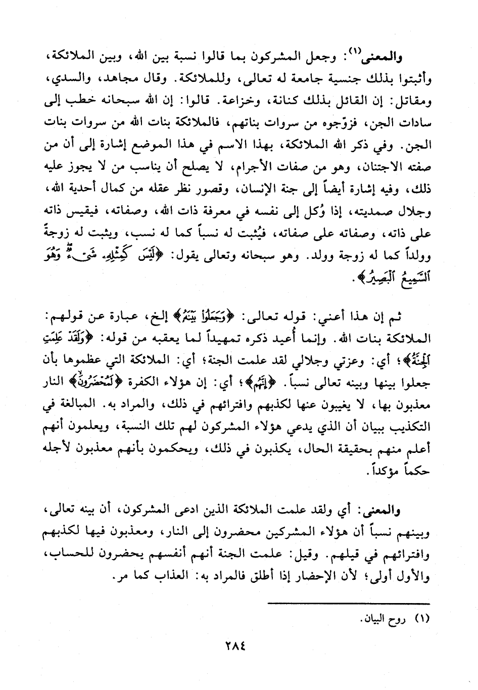 والمعنى: أي ولقد علمت الملائكة الذين ادعى المشركون، أن بينه تعالى، وبينهم نسبًا أن هؤلاء المشركين محضرون إلى النار، ومعذبون فيها لكذبهم وافترائهم في قيلهم. وقيل: علمت الجنة أنهم أنفسهم يحضرون للحساب، والأول أولى؛ لأن الإحضار إذا أطلق فالمراد به: العذاب كما مر.