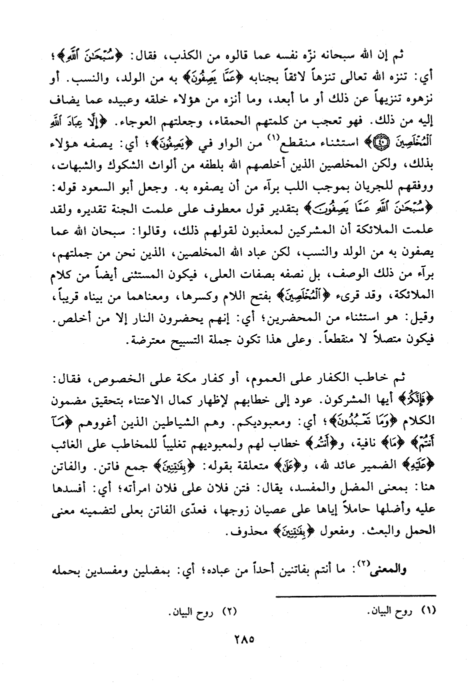160 - {إِلَّا عِبادَ اللَّهِ الْمُخْلَصِينَ (160)} استثناء منقطع (¬1) من الواو في {يَصِفُونَ}؛ أي: يصفه هؤلاء بذلك، ولكن المخلصين الذين أخلصهم الله بلطفه من ألواث الشكوك والشبهات، ووفقهم للجريان بموجب اللب برآء من أن يصفوه به. وجعل أبو السعود قوله: {سُبْحانَ اللَّهِ عَمَّا يَصِفُونَ} بتقدير قول معطوف على علمت الجنة تقديره ولقد علمت الملائكة أن المشركين لمعذبون لقولهم ذلك، وقالوا: سبحان الله عما يصفون به من الولد والنسب، لكن عباد الله المخلصين، الذين نحن من جملتهم، برآء من ذلك الوصف، بل نصفه بصفات العلى، فيكون المستثنى أيضًا من كلام الملائكة، وقد قرىء {الْمُخْلَصِينَ} بفتح اللام وكسرها، ومعناهما من بيناه قريبًا، وقيل: هو استثناء من المحضرين؛ أي: إنهم يحضرون النار إلا من أخلص. فيكون متصلًا لا منقطعًا. وعلى هذا تكون جملة التسبيح معترضة.