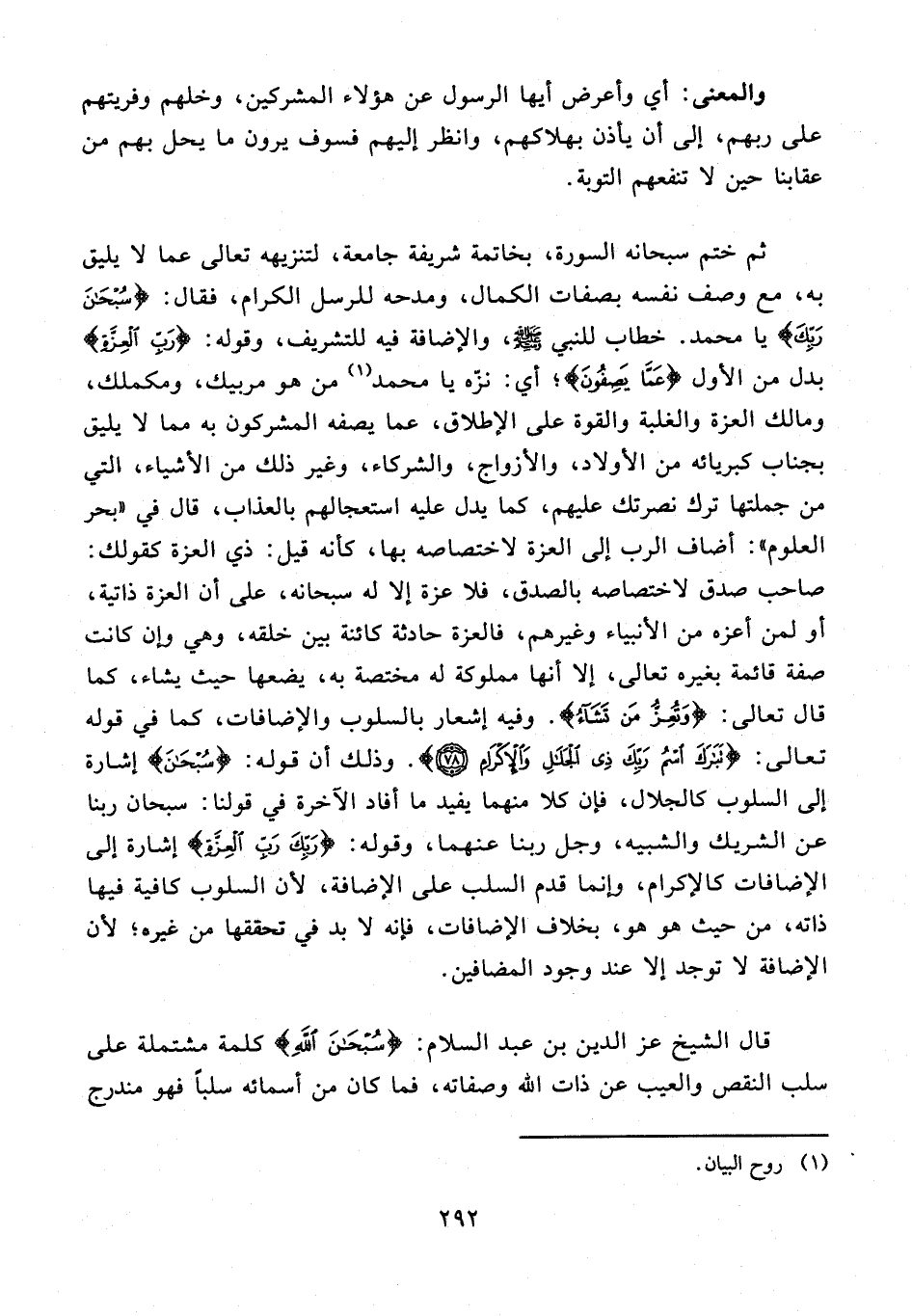 قال الشيخ عز الدين بن عبد السلام: {سُبْحانَ اللَّهِ} كلمة مشتملة على سلب النقص والعيب عن ذات الله وصفاته، فما كان من أسمائه سلبًا فهو مندرج