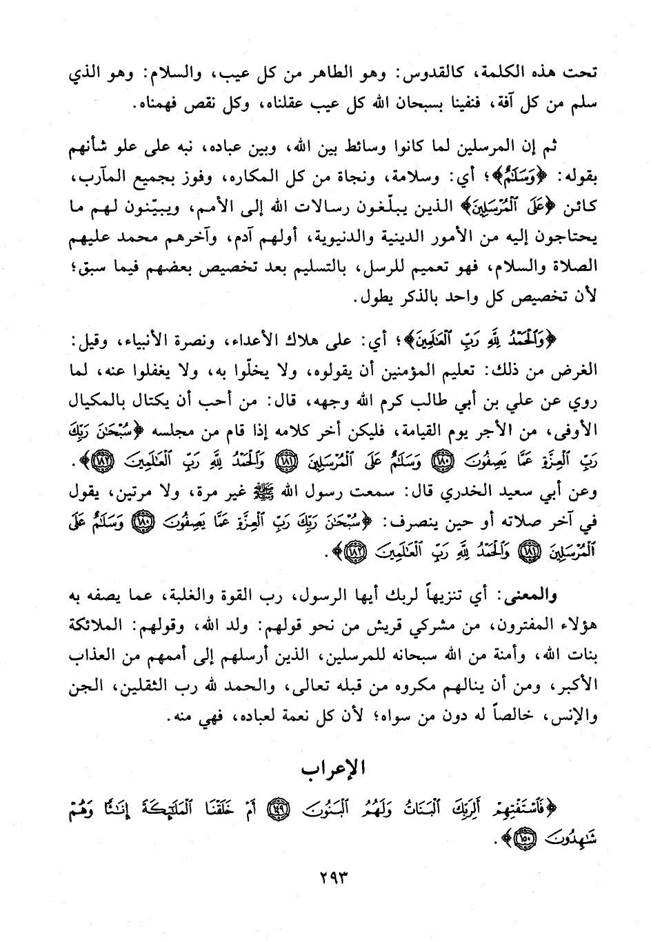 182 - {وَالْحَمْدُ لِلَّهِ رَبِّ الْعالَمِينَ}؛ أي: على هلاك الأعداء، ونصرة الأنبياء، وقيل: الغرض من ذلك: تعليم المؤمنين أن يقولوه، ولا يخلّوا به، ولا يغفلوا عنه، لما روي عن علي بن أبي طالب كرم الله وجهه، قال: من أحب أن يكتال بالمكيال الأوفى، من الأجر يوم القيامة، فليكن أخر كلامه إذا قام من مجلسه {سُبْحانَ رَبِّكَ رَبِّ الْعِزَّةِ عَمَّا يَصِفُونَ (180) وَسَلامٌ عَلَى الْمُرْسَلِينَ (181) وَالْحَمْدُ لِلَّهِ رَبِّ الْعالَمِينَ (182)}. وعن أبي سعيد الخدري قال: سمعت رسول الله - صلى الله عليه وسلم - غير مرة، ولا مرتين، يقول في آخر صلاته أو حين ينصرف: {سُبْحانَ رَبِّكَ رَبِّ الْعِزَّةِ عَمَّا يَصِفُونَ (180) وَسَلامٌ عَلَى الْمُرْسَلِينَ (181) وَالْحَمْدُ لِلَّهِ رَبِّ الْعالَمِينَ (182)}.