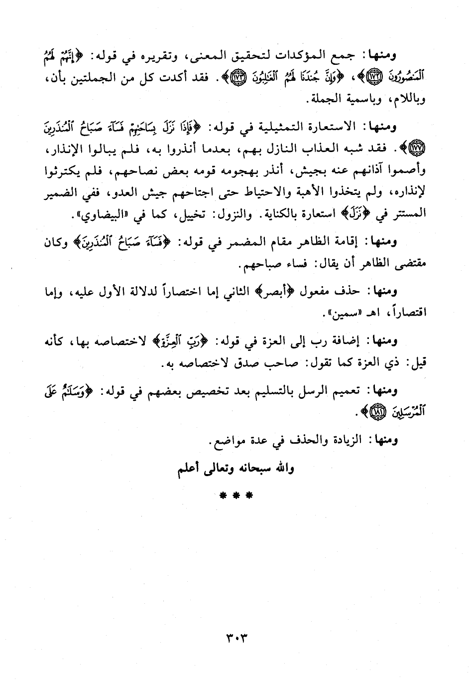 ومنها: الاستعارة التمثيلية في قوله: {فَإِذا نَزَلَ بِساحَتِهِمْ فَساءَ صَباحُ الْمُنْذَرِينَ (177)} فقد شبه العذاب النازل بهم، بعدما أنذروا به، فلم يبالوا الإنذار، وأصموا آذانهم عنه بجيش، أنذر بهجومه قومه بعض نصاحهم، فلم يكترثوا لإنذاره، ولم يتخذوا الأهبة والاحتياط حتى اجتاحهم جيش العدو، ففي الضمير المستتر في {نَزَلَ} استعارة بالكناية. والنزول: تخييل، كما في «البيضاوي».