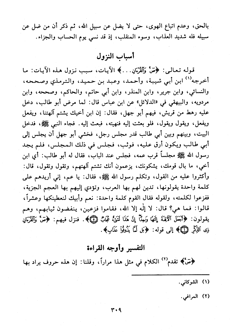 قوله تعالى: {ص وَالْقُرْآنِ ...} الآيات، سبب نزول هذه الآيات: ما أخرجه (¬1) ابن أبي شيبة، وأحمد، وعبد بن حميد، والترمذي وصححه، والنسائي، وابن جرير، وابن المنذر، وابن أبي حاتم، والحاكم، وصححه، وابن مردويه، والبيهقي في «الدلائل» عن ابن عباس قال: لما مرض أبو طالب، دخل عليه رهط من قريش، فيهم أبو جهل، فقال: إن ابن أخيك يشتم آلهتنا، ويفعل ويفعل، ويقول ويقول، فلو بعثت إليه فنهيته، فبعث إليه. فجاء النبي - صلى الله عليه وسلم -، فدخل البيت، وبينهم وبين أبي طالب قدر مجلس رجل، فخشي أبو جهل أن يجلس إلى أبي طالب ويكون أرق عليه، فوثب، فجلس في ذلك المجلس، فلم يجد رسول الله - صلى الله عليه وسلم - مجلسًا قرب عمه، فجلس عند الباب، فقال له أبو طالب: أي ابن أخي، ما بال قومك، يشكونك، يزعمون أنك تشتم آلهتهم، وتقول وتقول، قال: وأكثروا عليه من القول، وتكلم رسول الله - صلى الله عليه وسلم -، فقال، يا عم، إني أريدهم على كلمة واحدة يقولونها، تدين لهم بها العرب، وتؤدي إليهم بها العجم الجزية، ففزعوا لكلمته، ولقوله فقال القوم كلمة واحدة: نعم وأبيك لنعطينكها وعشرًا، قالوا: فما هي؟ قال: لا إله إلا الله، فقاموا فزعين، ينفضون ثيابهم، وهم يقولون: {أَجَعَلَ الْآلِهَةَ إِلهًا واحِدًا إِنَّ هذا لَشَيْءٌ عُجابٌ (5)}. فنزل فيهم: {ص وَالْقُرْآنِ ذِي الذِّكْرِ (1)} إلى قوله: {بَلْ لَمَّا يَذُوقُوا عَذابِ}.