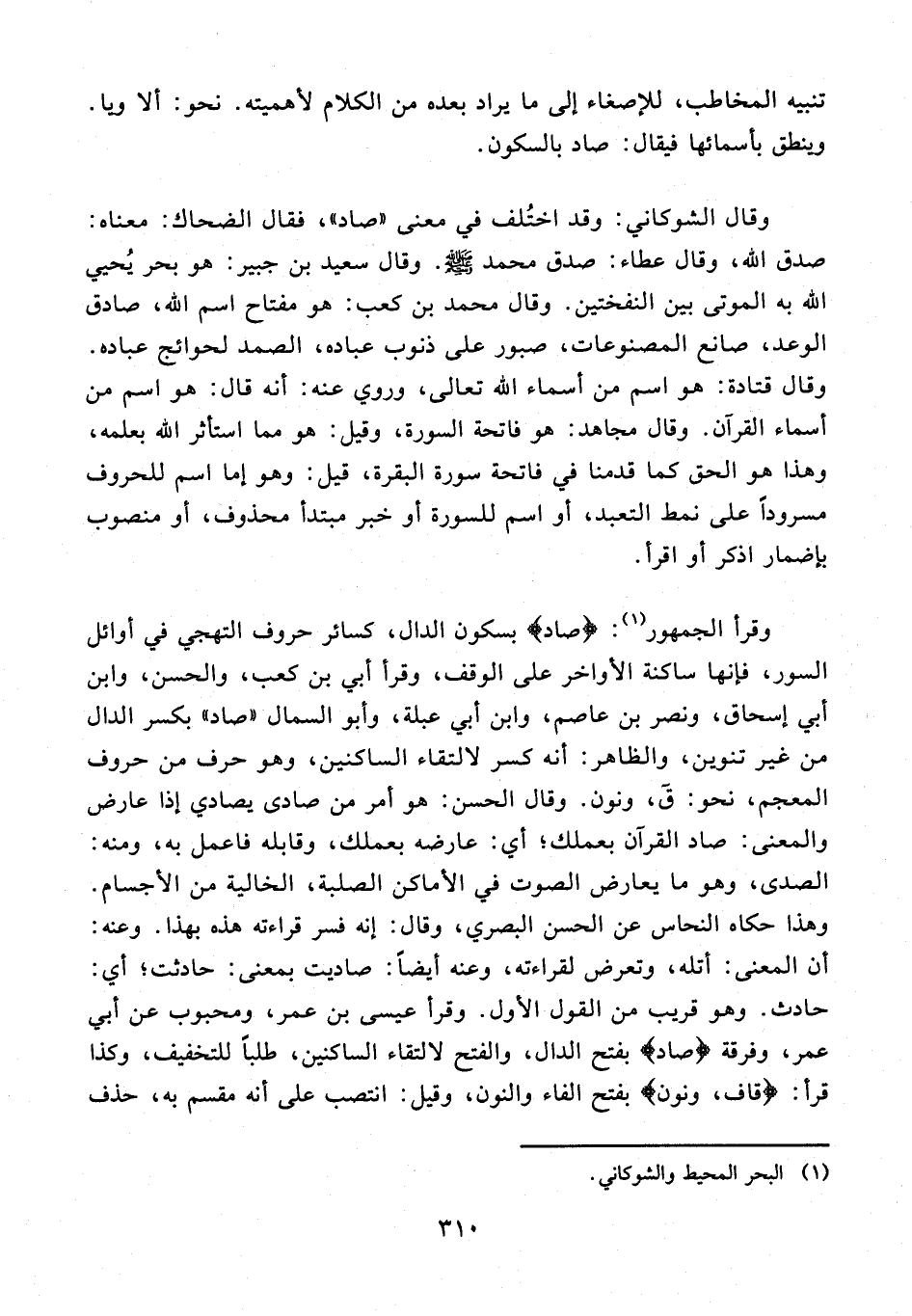 وقال الشوكاني: وقد اختلف في معنى «صاد»، فقال الضحاك: معناه: صدق الله، وقال عطاء: صدق محمد - صلى الله عليه وسلم -. وقال سعيد بن جبير: هو بحر يحيي الله به الموتى بين النفختين. وقال محمد بن كعب: هو مفتاح اسم الله، صادق الوعد، صانع المصنوعات، صبور على ذنوب عباده، الصمد لحوائج عباده. وقال قتادة: هو اسم من أسماء الله تعالى، وروي عنه: أنه قال: هو اسم من أسماء القرآن. وقال مجاهد: هو فاتحة السورة، وقيل: هو مما استأثر الله بعلمه، وهذا هو الحق كما قدمنا في فاتحة سورة البقرة، قيل: وهو إما اسم للحروف مسرودا على نمط التعبد، أو اسم للسورة أو خبر مبتدأ محذوف، أو منصوب بإضمار اذكر أو اقرأ.