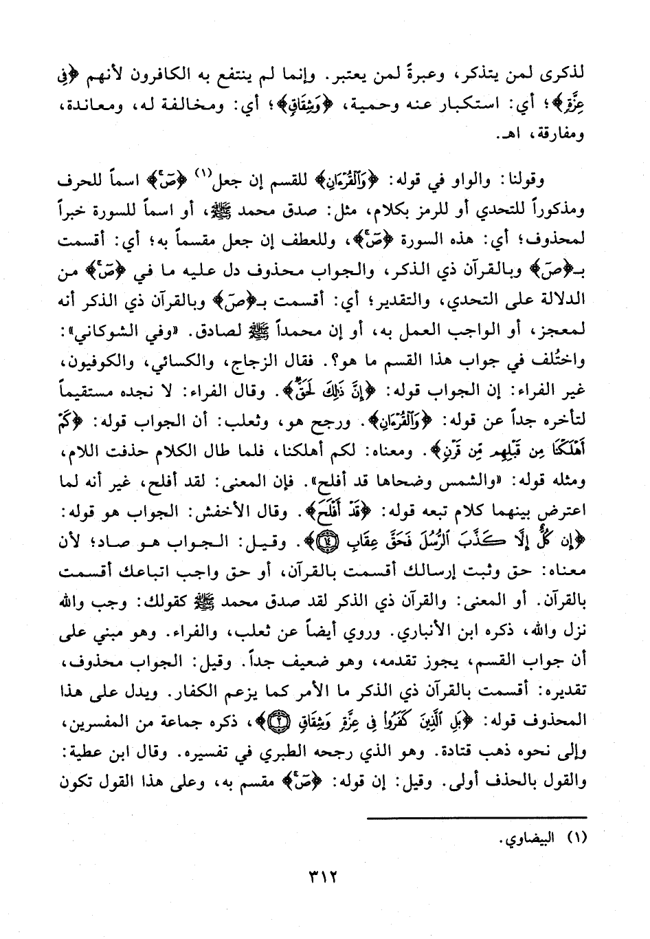 وقولنا: والواو في قوله: {وَالْقُرْآنِ} للقسم إن جعل (¬1) {ص} اسمًا للحرف ومذكورًا للتحدي أو للرمز بكلام، مثل: صدق محمد - صلى الله عليه وسلم -، أو اسمًا للسورة خبرًا لمحذوف؛ أي: هذه السورة {ص}، وللعطف إن جعل مقسمًا به؛ أي: أقسمت بـ {ص} وبالقرآن ذي الذكر، والجواب محذوف دل عليه ما في {ص} من الدلالة على التحدي، والتقدير؛ أي: أقسمت بـ {ص} وبالقرآن ذي الذكر أنه لمعجز، أو الواجب العمل به، أو إن محمدًا - صلى الله عليه وسلم - لصادق. «وفي الشوكاني»: واختلف في جواب هذا القسم ما هو؟. فقال الزجاج، والكسائي، والكوفيون، غير الفراء: إن الجواب قوله: {إِنَّ ذلِكَ لَحَقٌّ}. وقال الفراء: لا نجده مستقيمًا لتأخره جدًا عن قوله: {وَالْقُرْآنِ}. ورجح هو، وثعلب: أن الجواب قوله: {كَمْ أَهْلَكْنا مِنْ قَبْلِهِمْ مِنْ قَرْنٍ}. ومعناه: لكم أهلكنا، فلما طال الكلام حذفت اللام، ومثله قوله: «والشمس وضحاها قد أفلح». فإن المعنى: لقد أفلح، غير أنه لما اعترض بينهما كلام تبعه قوله: {قَدْ أَفْلَحَ}. وقال الأخفش: الجواب هو قوله: {إِنْ كُلٌّ إِلَّا كَذَّبَ الرُّسُلَ فَحَقَّ عِقابِ (14)}. وقيل: الجواب هو صاد؛ لأن معناه: حق وثبت إرسالك أقسمت بالقرآن، أو حق واجب اتباعك أقسمت بالقرآن. أو المعنى: والقرآن ذي الذكر لقد صدق محمد - صلى الله عليه وسلم - كقولك: وجب والله نزل والله، ذكره ابن الأنباري. وروي أيضًا عن ثعلب، والفراء. وهو مبني على أن جواب القسم، يجوز تقدمه، وهو ضعيف جدًا. وقيل: الجواب محذوف، تقديره: أقسمت بالقرآن ذي الذكر ما الأمر كما يزعم الكفار. ويدل على هذا المحذوف قوله: {بَلِ الَّذِينَ كَفَرُوا فِي عِزَّةٍ وَشِقاقٍ (2)}، ذكره جماعة من المفسرين، وإلى نحوه ذهب قتادة. وهو الذي رجحه الطبري في تفسيره. وقال ابن عطية: والقول بالحذف أولى. وقيل: إن قوله: {ص} مقسم به، وعلى هذا القول تكون