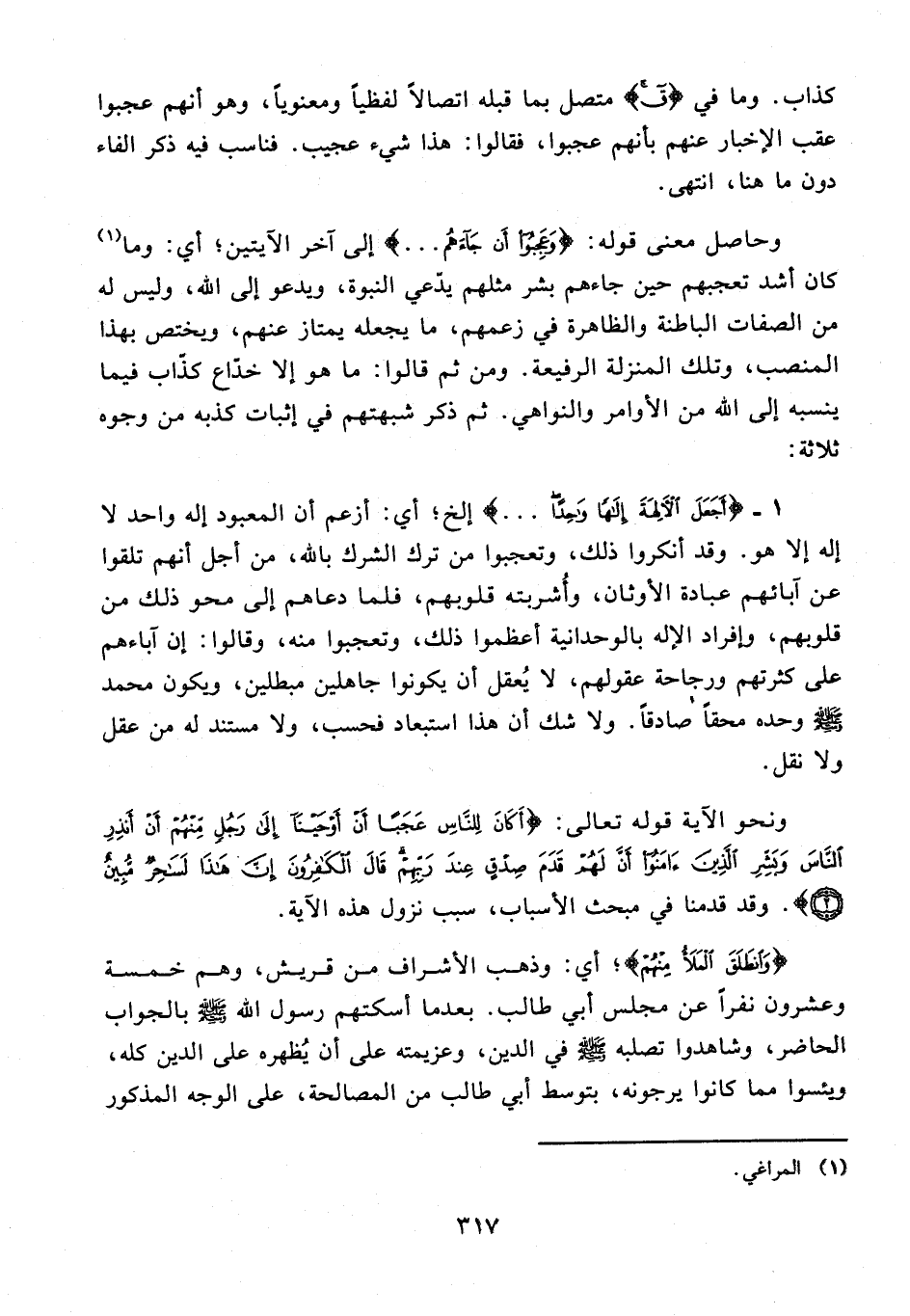 1 - {أَجَعَلَ الْآلِهَةَ إِلهًا واحِدًا ...} إلخ؛ أي: أزعم أن المعبود إله واحد لا إله إلا هو. وقد أنكروا ذلك، وتعجبوا من ترك الشرك بالله، من أجل أنهم تلقوا عن آبائهم عبادة الأوثان، وأشربته قلوبهم، فلما دعاهم إلى محو ذلك من قلوبهم، وإفراد الإله بالوحدانية أعظموا ذلك، وتعجبوا منه، وقالوا: إن آباءهم على كثرتهم ورجاحة عقولهم، لا يعقل أن يكونوا جاهلين مبطلين، ويكون محمد - صلى الله عليه وسلم - وحده محقًا صادقًا. ولا شك أن هذا استبعاد فحسب، ولا مستند له من عقل ولا نقل.