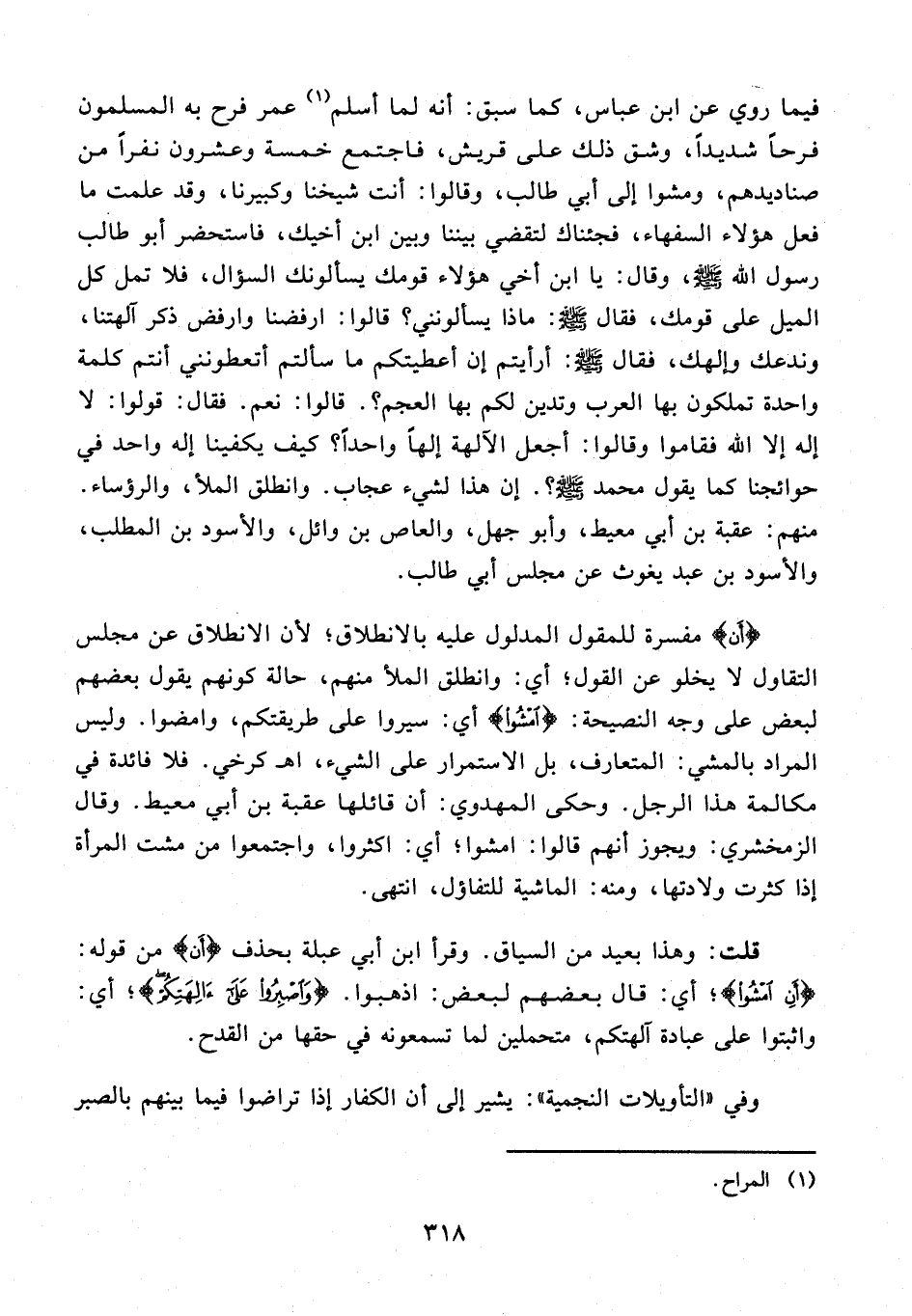 فيما روي عن ابن عباس، كما سبق: أنه لما أسلم (¬1) عمر فرح به المسلمون فرحا شديدا، وشق ذلك على قريش، فاجتمع خمسة وعشرون نفرًا من صناديدهم، ومشوا إلى أبي طالب، وقالوا: أنت شيخنا وكبيرنا، وقد علمت ما فعل هؤلاء السفهاء، فجئناك لتقضي بيننا وبين ابن أخيك، فاستحضر أبو طالب رسول الله - صلى الله عليه وسلم -، وقال: يا ابن أخي هؤلاء قومك يسألونك السؤال، فلا تمل كل الميل على قومك، فقال - صلى الله عليه وسلم -: ماذا يسألونني؟ قالوا: ارفضنا وارفض ذكر آلهتنا، وندعك وإلهك، فقال - صلى الله عليه وسلم -: أرأيتم إن أعطيتكم ما سألتم أتعطونني أنتم كلمة واحدة تملكون بها العرب وتدين لكم بها العجم؟. قالوا: نعم. فقال: قولوا: لا إله إلا الله فقاموا وقالوا: أجعل الآلهة إلهًا واحدًا؟ كيف يكفينا إلها واحد في حوائجنا كما يقول محمد - صلى الله عليه وسلم -؟. إن هذا لشيء عجاب. وانطلق الملأ، والرؤساء. منهم: عقبة بن أبي معيط، وأبو جهل، والعاص بن وائل، والأسود بن المطلب، والأسود بن عبد يغوث عن مجلس أبي طالب.