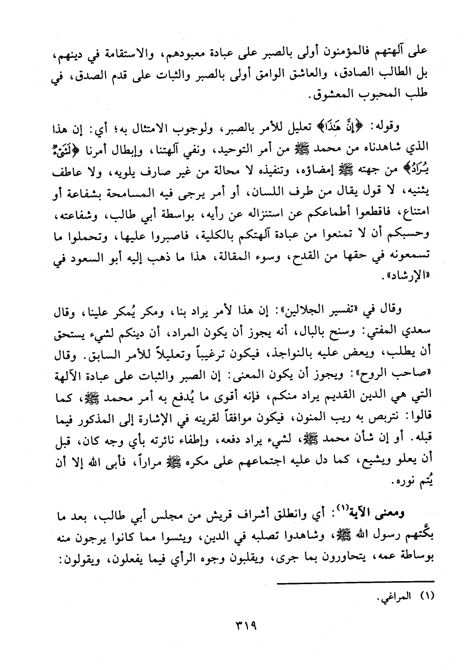 وقال في «تفسير الجلالين»: إن هذا لأمر يراد بنا، ومكر يمكر علينا، وقال سعدي المفتي: وسنح بالبال، أنه يجوز أن يكون المراد، أن دينكم لشيء يستحق أن يطلب، ويعض عليه بالنواجذ، فيكون ترغيبًا وتعليلًا للأمر السابق. وقال «صاحب الروح»: ويجوز أن يكون المعنى: إن الصبر والثبات على عبادة الآلهة التي هي الدين القديم يراد منكم، فإنه أقوى ما يدفع به أمر محمد - صلى الله عليه وسلم -، كما قالوا: نتربص به ريب المنون، فيكون موافقا لقرينه في الإشارة إلى المذكور فيما قبله. أو إن شأن محمد - صلى الله عليه وسلم -، لشيء يراد دفعه، وإطفاء نائرته بأي وجه كان، قبل أن يعلو ويشيع، كما دل عليه اجتماعهم على مكره - صلى الله عليه وسلم - مرارًا، فأبى الله إلا أن يتم نوره.