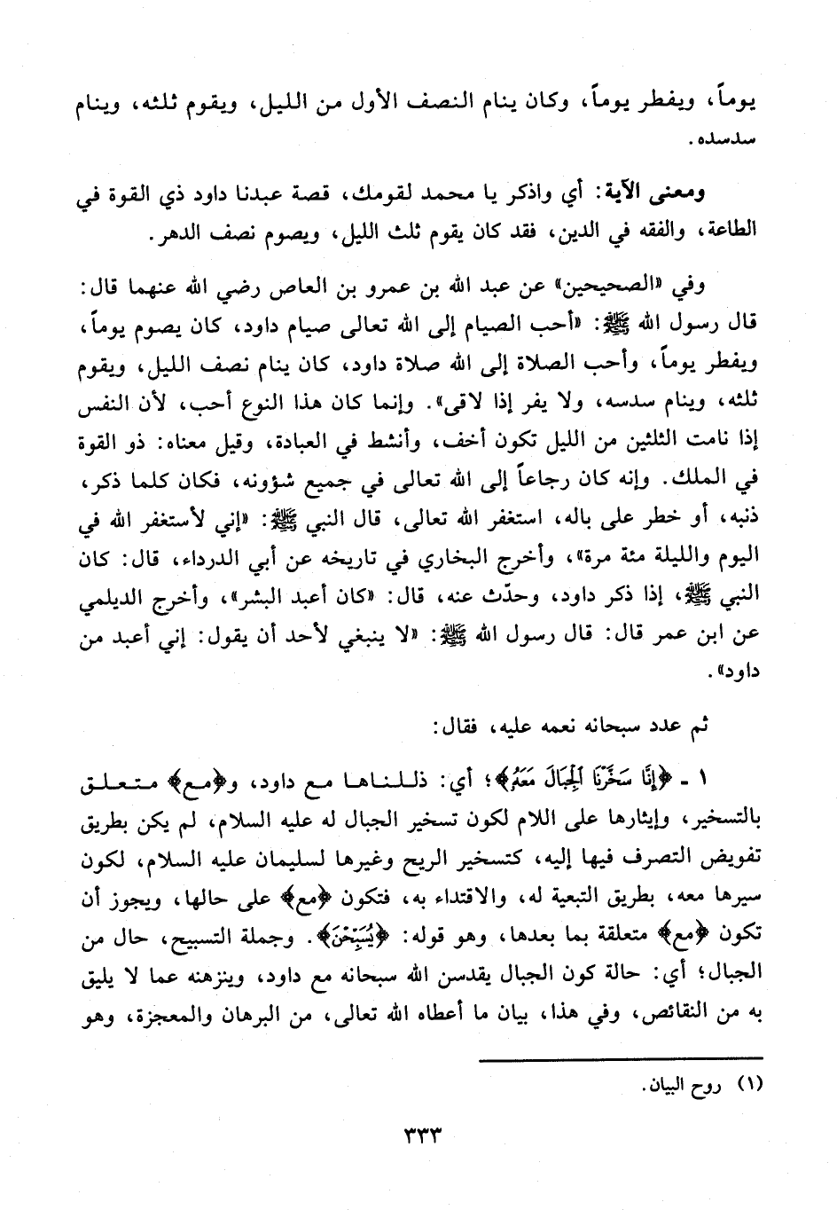وفي «الصحيحين» عن عبد الله بن عمرو بن العاص رضي الله عنهما قال: قال رسول الله - صلى الله عليه وسلم -: «أحب الصيام إلى الله تعالى صيام داود، كان يصوم يوما، ويفطر يوما، وأحب الصلاة إلى الله صلاة داود، كان ينام نصف الليل، ويقوم ثلثه، وينام سدسه، ولا يفر إذا لاقى». وإنما كان هذا النوع أحب، لأن النفس إذا نامت الثلثين من الليل تكون أخف، وأنشط في العبادة، وقيل معناه: ذو القوة في الملك. وإنه كان رجاعًا إلى الله تعالى في جميع شؤونه، فكان كلما ذكر، ذنبه، أو خطر على باله، استغفر الله تعالى، قال النبي - صلى الله عليه وسلم -: «إني لأستغفر الله في اليوم والليلة مئة مرة»، وأخرج البخاري في تاريخه عن أبي الدرداء، قال: كان النبي - صلى الله عليه وسلم -، إذا ذكر داود، وحدّث عنه، قال: «كان أعبد البشر»، وأخرج الديلمي عن ابن عمر قال: قال رسول الله - صلى الله عليه وسلم -: «لا ينبغي لأحد أن يقول: إني أعبد من داود».