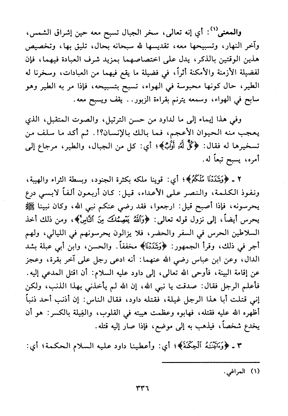 2 - 20 {وَشَدَدْنا مُلْكَهُ}؛ أي: قوينا ملكه بكثرة الجنود، وبسطة الثراء والهيبة، ونفوذ الكلمة، والنصر على الأعداء، قيل: كان أربعون ألفا لابسي درع يحرسونه، فإذا أصبح قيل: ارجعوا، فقد رضي عنكم نبي الله، وكان نبينا - صلى الله عليه وسلم - يحرس أيضًا، إلى نزول قوله تعالى: {وَاللَّهُ يَعْصِمُكَ مِنَ النَّاسِ}، ومن ذلك أخذ السلاطين الحرس في السفر والحضر، فلا يزالون يحرسونهم في الليالي، ولهم أجر في ذلك، وقرأ الجمهور: {وَشَدَدْنا} مخففًا. والحسن، وابن أبي عبلة بشد الدال، وعن ابن عباس رضي الله عنهما: أنه ادعى رجل على آخر بقرة، وعجز عن إقامة البينة، فأوحى الله تعالى، إلى داود عليه السلام: أن اقتل المدعي إليه. فأعلم الرجل فقال: صدقت يا نبي الله، إن الله لم يأخذني بهذا الذنب، ولكن إني قتلت أبا هذا الرجل غيلة، فقتله داود، فقال الناس: إن أذنب أحد ذنبًا أظهره الله عليه فقتله، فهابوه وعظمت هيبته في القلوب، والغيلة بالكسر: هو أن يخدع شخصا، فيذهب به إلى موضع، فإذا صار إليه قتله.