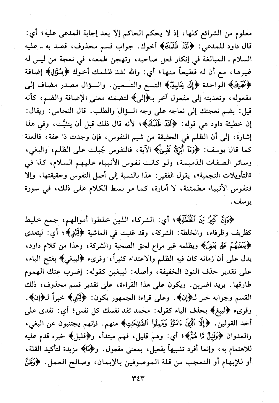 {وَإِنَّ كَثِيرًا مِنَ الْخُلَطاءِ}؛ أي: الشركاء الذين خلطوا أموالهم، جمع خليط كظريف وظرفاء، والخلطة: الشركة، وقد غلبت في الماشية {لَيَبْغِي}؛ أي: ليتعدى {بَعْضُهُمْ عَلى بَعْضٍ} ويظلمه غير مراع لحق الصحبة والشركة، وهذا من كلام داود، يدل على أن زمانه كان فيه الظلم والاعتداء كثيرًا، وقرىء {ليبغي} بفتح الياء، على تقدير حذف النون الخفيفة، وأصله: ليبغين كقوله: إضرب عنك الهموم طارقها. يريد اضربن. ويكون على هذا القراءة، على تقدير قسم محذوف، ذلك القسم وجوابه خبر لـ {إِنَّ}. وعلى قراءة الجمهور يكون: {لَيَبْغِي} خبرًا لـ {إِنَّ}. وقرىء {ليبغ} بحذف الياء كقوله: محمد تفد نفسك كل نفس؛ أي: تفدى على أحد القولين. {إِلَّا الَّذِينَ آمَنُوا وَعَمِلُوا الصَّالِحاتِ} منهم. فإنهم يجتنبون عن البغي، والعدوان {وَقَلِيلٌ ما هُمْ}؛ أي: وهم قليل، فهم مبتدأ، و {قَلِيلٌ} خبره قدم عليه للاهتمام به، وإنما أفرد تشبيها بفعيل، بمعنى مفعول. و {ما} مزيدة لتأكيد القلة، أو للإبهام أو التعجب من قلة الموصوفين بالإيمان، وصالح العمل. {وَظَنَ