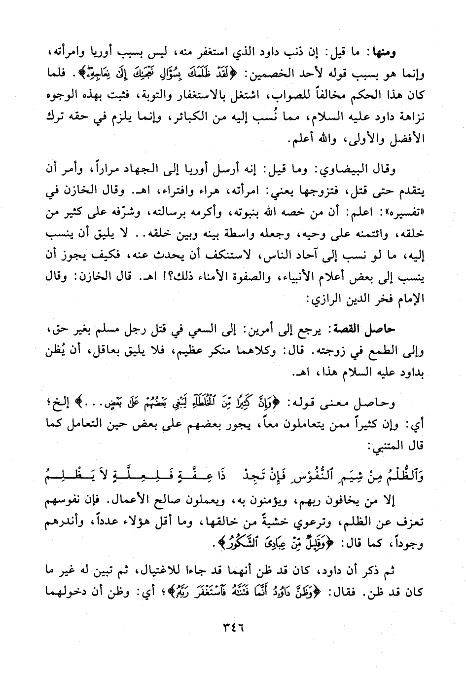 ومنها: ما قيل: إن ذنب داود الذي استغفر منه، ليس بسبب أوريا وامرأته، وإنما هو بسبب قوله لأحد الخصمين: {لَقَدْ ظَلَمَكَ بِسُؤالِ نَعْجَتِكَ إِلى نِعاجِهِ}. فلما كان هذا الحكم مخالفًا للصواب، اشتغل بالاستغفار والتوبة، فثبت بهذه الوجوه نزاهة داود عليه السلام، مما نسب إليه من الكبائر، وإنما يلزم في حقه ترك الأفضل والأولى، والله أعلم.