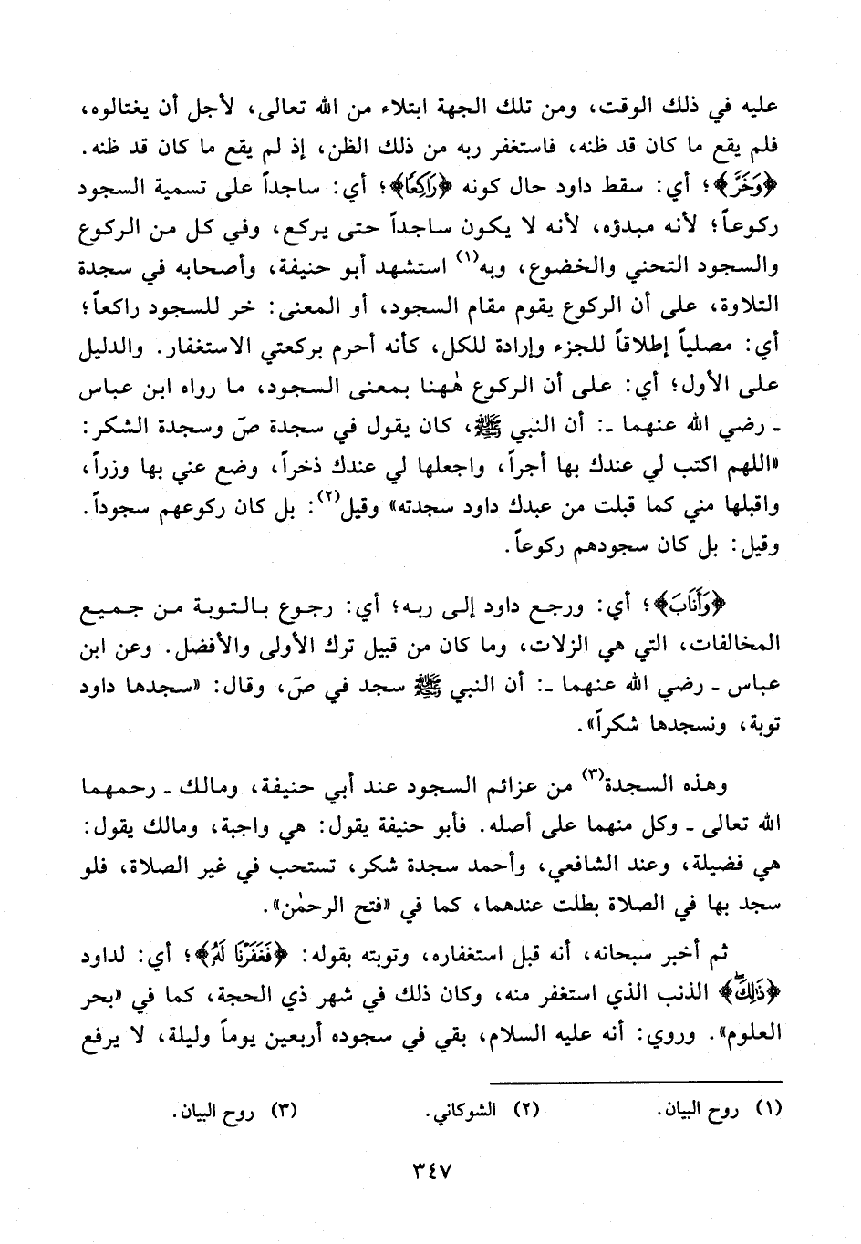 {وَأَنابَ}؛ أي: ورجع داود إلى ربه؛ أي: رجوع بالتوبة من جميع المخالفات، التي هي الزلات، وما كان من قبيل ترك الأولى والأفضل. وعن ابن عباس - رضي الله عنهما -: أن النبي - صلى الله عليه وسلم - سجد في ص، وقال: «سجدها داود توبة، ونسجدها شكرًا».