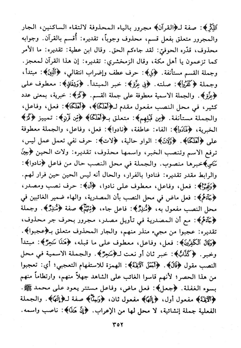 الذِّكْرِ}: صفة لـ {الْقُرْآنِ} مجرور بالياء المحذوفة لالتقاء الساكنين، الجار والمجرور متعلق بفعل قسم، محذوف وجوبًا، تقديره: أقسم بالقرآن. وجوابه محذوف، قدّره الحوفيّ: لقد جاءكم الحق. وقال ابن عطية: تقديره: ما الأمر كما تزعمون يا أهل مكة، وقال الزمخشري: تقديره: إن هذا القرآن لمعجز. وجملة القسم مستأنفة. {بَلِ}: حرف عطف وإضراب انتقالي، {الَّذِينَ}: مبتدأ، وجملة {كَفَرُوا}: صلته. {فِي عِزَّةٍ}: خبر المبتدأ. {وَشِقاقٍ}: معطوف على {عِزَّةٍ}. والجملة الاسمية معطوفة على جملة القسم. {كَمْ}: خبرية، بمعنى عدد كثير، في محل النصب مفعول مقدم لـ {أَهْلَكْنا}، {أَهْلَكْنا}: فعل، وفاعل، والجملة مستأنفة. {مِنْ قَبْلِهِمْ}: متعلق بـ {أَهْلَكْنا} {مِنْ قَرْنٍ}: تمييز {كَمْ} الخبرية، {فَنادَوْا}: الفاء: عاطفة، {نادوا}: فعل، وفاعل، والجملة معطوفة على {أَهْلَكْنا}. {وَلاتَ}: الواو حالية، {لاتَ}: حرف نفي تعمل عمل ليس، ترفع الاسم وتنصب الخبر، واسمها محذوف، تقديره: ولات الحين {حِينَ مَناصٍ} خبرها منصوب. والجملة في محل النصب حال من فاعل {نادوا}: والرابط مقدر تقديره: فنادوا بالفرار، والحال أنه ليس الحين حين فرار لهم. {وَعَجِبُوا}: فعل، وفاعل، معطوف على نادوا، {أَنْ}: حرف نصب ومصدر، {جاءَهُمْ}: فعل ماض في محل النصب بأن المصدرية، والهاء ضمير الغائبين في محل النصب مفعول به، {مُنْذِرٌ}: فاعل جاء، {مِنْهُمْ} صفة {مُنْذِرٌ}. وجملة {جاءَهُمْ}: مع أن المصدرية في تأويل مصدر، مجرور بحرف جر محذوف، تقديره: عجبوا من مجيء منذر منهم، والجار المحذوف متعلق بـ {عَجِبُوا}. {وَقالَ الْكافِرُونَ}: فعل، وفاعل، معطوف على ما قبله، {هذا ساحِرٌ}: مبتدأ وخبر. {كَذَّابٌ}: خبر ثان أو نعت لـ {ساحِرٌ}. والجملة الاسمية في محل النصب مقول {قالَ}. {أَجَعَلَ الْآلِهَةَ}: الهمزة للاستفهام التعجبي؛ أي: تعجبوا من هذا الحصر؛ لأنهم قاسوا الغائب على الشاهد جهلًا منهم، وارتطامًا منهم بسوء الغفلة. {جَعَلَ}: فعل ماض، وفاعل مستتر يعود على محمد - صلى الله عليه وسلم -. {الْآلِهَةَ} مفعول أول، {إِلهًا} مفعول ثان، {واحِدًا} صفة لـ {إِلهًا}. والجملة الفعلية جملة إنشائية، لا محل لها من الإعراب. {إِنَّ هذا}: ناصب واسمه.