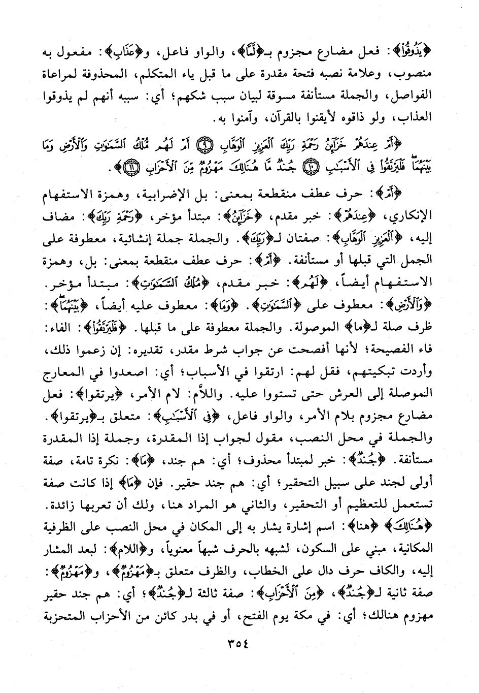 {أَمْ}: حرف عطف منقطعة بمعنى: بل الإضرابية، وهمزة الاستفهام الإنكاري، {عِنْدَهُمْ}: خبر مقدم، {خَزائِنُ}: مبتدأ مؤخر، {رَحْمَةِ رَبِّكَ}: مضاف إليه، {الْعَزِيزِ الْوَهَّابِ}: صفتان لـ {رَبِّكَ}. والجملة جملة إنشائية، معطوفة على الجمل التي قبلها أو مستأنفة. {أَمْ}: حرف عطف منقطعة بمعنى: بل، وهمزة الاستفهام أيضًا، {لَهُمْ}: خبر مقدم، {مُلْكُ السَّماواتِ}: مبتدأ مؤخر. {وَالْأَرْضِ}: معطوف على {السَّماواتِ}. {وَما}: معطوف عليه أيضًا، {بَيْنَهُما}: ظرف صلة لـ {ما} الموصولة. والجملة معطوفة على ما قبلها. {فَلْيَرْتَقُوا}: الفاء: فاء الفصيحة؛ لأنها أفصحت عن جواب شرط مقدر، تقديره: إن زعموا ذلك، وأردت تبكيتهم، فقل لهم: ارتقوا في الأسباب؛ أي: اصعدوا في المعارج الموصلة إلى العرش حتى تستووا عليه. واللّام: لام الأمر، {يرتقوا}: فعل مضارع مجزوم بلام الأمر، والواو فاعل، {فِي الْأَسْبابِ}: متعلق بـ {يرتقوا}. والجملة في محل النصب، مقول لجواب إذا المقدرة، وجملة إذا المقدرة مستأنفة. {جُنْدٌ}: خبر لمبتدأ محذوف؛ أي: هم جند، {ما}: نكرة تامة، صفة أولى لجند على سبيل التحقير؛ أي: هم جند حقير. فإن {ما} إذا كانت صفة تستعمل للتعظيم أو التحقير، والثاني هو المراد هنا، ولك أن تعربها زائدة. {هُنالِكَ} {هنا}: اسم إشارة يشار به إلى المكان في محل النصب على الظرفية المكانية، مبني على السكون، لشبهه بالحرف شبهًا معنويًا، و {اللام}: لبعد المشار إليه، والكاف حرف دال على الخطاب، والظرف متعلق بـ {مَهْزُومٌ}، و {مَهْزُومٌ}: صفة ثانية لـ {جُنْدٌ}، {مِنَ الْأَحْزابِ}: صفة ثالثة لـ {جُنْدٌ}؛ أي: هم جند حقير مهزوم هنالك؛ أي: في مكة يوم الفتح، أو في بدر كائن من الأحزاب المتحزبة