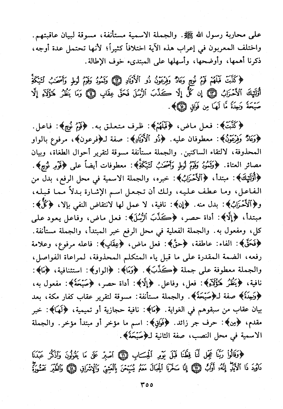 {كَذَّبَتْ}: فعل ماض، {قَبْلَهُمْ}: ظرف متعلق به. {قَوْمُ نُوحٍ}: فاعل. {وَعادٌ وَفِرْعَوْنُ}: معطوفان عليه. {ذُو الْأَوْتادِ}: صفة لـ {فِرْعَوْنُ}، مرفوع بالواو المحذوفة، لالتقاء الساكنين. والجملة مستأنفة مسوقة لتقرير أحوال الطغاة، وبيان مصائر العتاة. {وَثَمُودُ وَقَوْمُ لُوطٍ وَأَصْحابُ الْأَيْكَةِ}: معطوفات أيضًا على {قَوْمُ نُوحٍ}. {أُولئِكَ}: مبتدأ، {الْأَحْزابُ}: خبره، والجملة الاسمية في محل الرفع، بدل من الفاعل، وما عطف عليه، ولك أن تجعل اسم الإشارة بدلًا مما قبله، و {الْأَحْزابُ}: بدل منه. {إِنْ}: نافية، لا عمل لها لانتقاض النفي بإلا، {كُلٌّ}: مبتدأ، {إِلَّا}: أداة حصر، {كَذَّبَ الرُّسُلَ}: فعل ماض، وفاعل يعود على كل، ومفعول به. والجملة الفعلية في محل الرفع خبر المبتدأ، والجملة مستأنفة. {فَحَقَّ}: الفاء: عاطفة، {حق}: فعل ماض، {عِقَابِ}: فاعله مرفوع، وعلامة رفعه، الضمة المقدرة على ما قبل ياء المتكلم المحذوفة، لمراعاة الفواصل، والجملة معطوفة على جملة {كَذَّبَ}. {وَما}: {الواو}: استئنافية، {ما}: نافية، {يَنْظُرُ هؤُلاءِ}: فعل، وفاعل. {إِلَّا}: أداة حصر، {صَيْحَةً}: مفعول به، {واحِدَةً} صفة لـ {صَيْحَةً}. والجملة مستأنفة: مسوقة لتقرير عقاب كفار مكة، بعد بيان عقاب من سبقوهم في الغواية. {ما}: نافية حجازية أو تميمية، {لَهَا}: خبر مقدم، {مِنْ}: حرف جر زائد. {فَواقٍ}: اسم ما مؤخر أو مبتدأ مؤخر. والجملة الاسمية في محل النصب، صفة الثانية لـ {صَيْحَةً}.