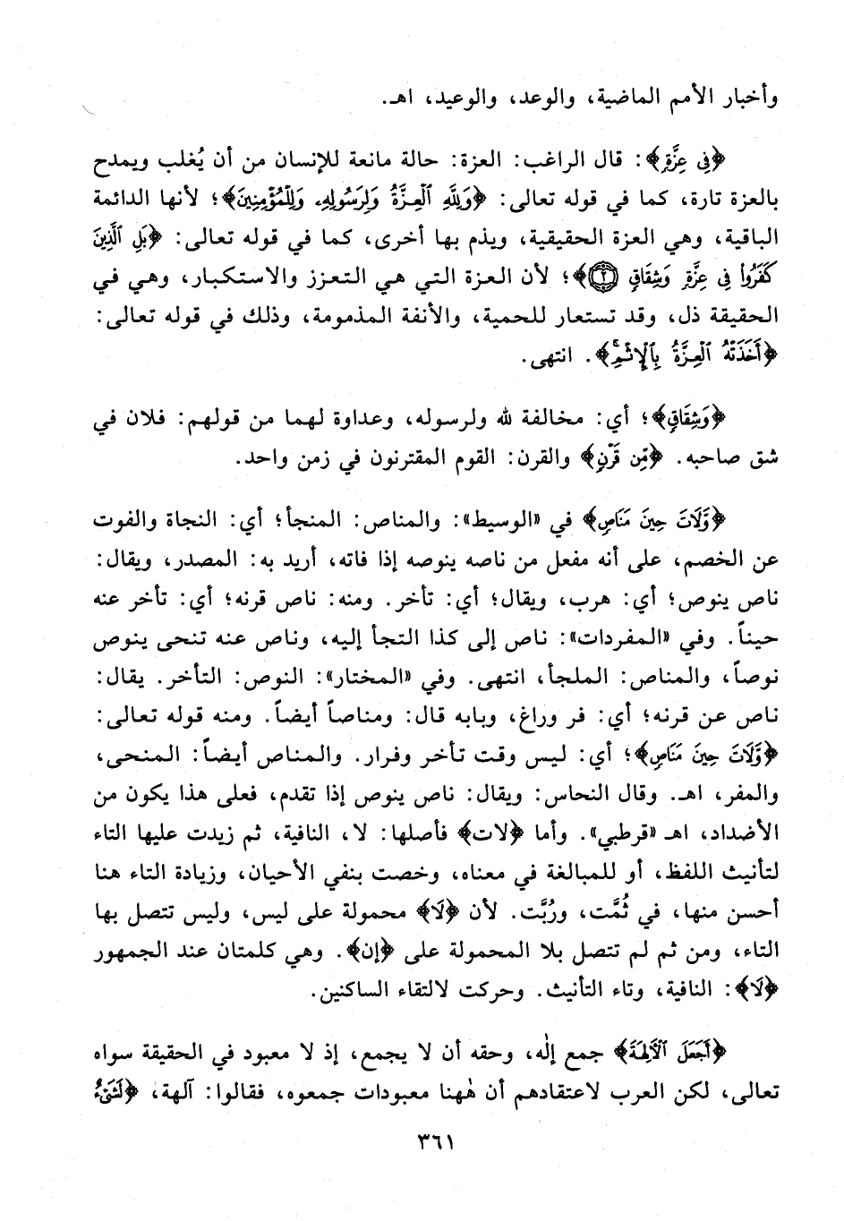 {وَلاتَ حِينَ مَناصٍ} في «الوسيط»: والمناص: المنجأ؛ أي: النجاة والفوت عن الخصم، على أنه مفعل من ناصه ينوصه إذا فاته، أريد به: المصدر، ويقال: ناص ينوص؛ أي: هرب، ويقال؛ أي: تأخر. ومنه: ناص قرنه؛ أي: تأخر عنه حينًا. وفي «المفردات»: ناص إلى كذا التجأ إليه، وناص عنه تنحى ينوص نوصا، والمناص: الملجأ، انتهى. وفي «المختار»: النوص: التأخر. يقال: ناص عن قرنه؛ أي: فر وراغ، وبابه قال: ومناصًا أيضًا. ومنه قوله تعالى: {وَلاتَ حِينَ مَناصٍ}؛ أي: ليس وقت تأخر وفرار. والمناص أيضًا: المنحى، والمفر، اهـ. وقال النحاس: ويقال: ناص ينوص إذا تقدم، فعلى هذا يكون من الأضداد، اهـ «قرطبي». وأما لاتَ فأصلها: لا، النافية، ثم زيدت عليها التاء لتأنيث اللفظ، أو للمبالغة في معناه، وخصت بنفي الأحيان، وزيادة التاء هنا أحسن منها، في ثُمَّت، ورُبَّت. لأن {لا} محمولة على ليس، وليس تتصل بها التاء، ومن ثم لم تتصل بلا المحمولة على {إن}. وهي كلمتان عند الجمهور {لا}: النافية، وتاء التأنيث. وحركت لالتقاء الساكنين.