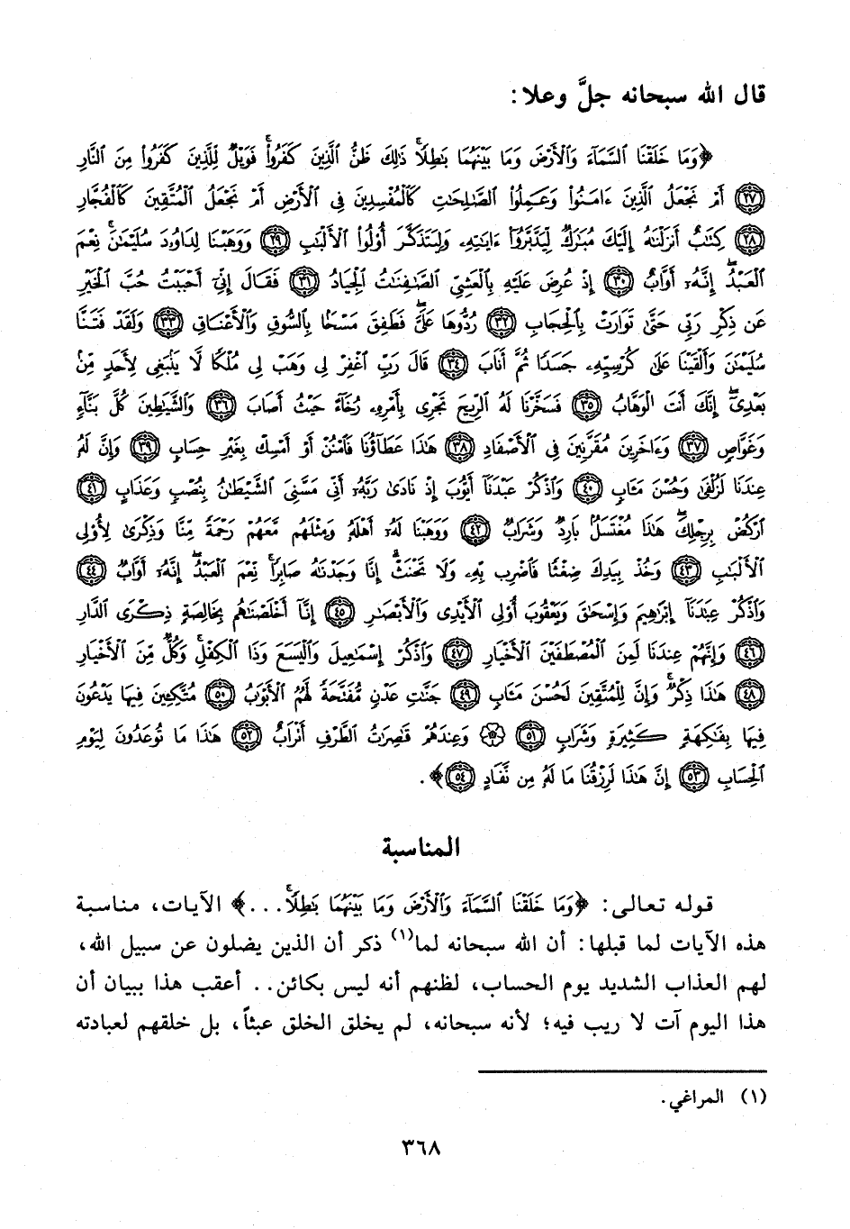 {وَمَا خَلَقْنَا السَّمَاءَ وَالْأَرْضَ وَمَا بَيْنَهُمَا بَاطِلًا ذَلِكَ ظَنُّ الَّذِينَ كَفَرُوا فَوَيْلٌ لِلَّذِينَ كَفَرُوا مِنَ النَّارِ (27) أَمْ نَجْعَلُ الَّذِينَ آمَنُوا وَعَمِلُوا الصَّالِحَاتِ كَالْمُفْسِدِينَ فِي الْأَرْضِ أَمْ نَجْعَلُ الْمُتَّقِينَ كَالْفُجَّارِ (28) كِتَابٌ أَنْزَلْنَاهُ إِلَيْكَ مُبَارَكٌ لِيَدَّبَّرُوا آيَاتِهِ وَلِيَتَذَكَّرَ أُولُو الْأَلْبَابِ (29) وَوَهَبْنَا لِدَاوُودَ سُلَيْمَانَ نِعْمَ الْعَبْدُ إِنَّهُ أَوَّابٌ (30) إِذْ عُرِضَ عَلَيْهِ بِالْعَشِيِّ الصَّافِنَاتُ الْجِيَادُ (31) فَقَالَ إِنِّي أَحْبَبْتُ حُبَّ الْخَيْرِ عَنْ ذِكْرِ رَبِّي حَتَّى تَوَارَتْ بِالْحِجَابِ (32) رُدُّوهَا عَلَيَّ فَطَفِقَ مَسْحًا بِالسُّوقِ وَالْأَعْنَاقِ (33) وَلَقَدْ فَتَنَّا سُلَيْمَانَ وَأَلْقَيْنَا عَلَى كُرْسِيِّهِ جَسَدًا ثُمَّ أَنَابَ (34) قَالَ رَبِّ اغْفِرْ لِي وَهَبْ لِي مُلْكًا لَا يَنْبَغِي لِأَحَدٍ مِنْ بَعْدِي إِنَّكَ أَنْتَ الْوَهَّابُ (35) فَسَخَّرْنَا لَهُ الرِّيحَ تَجْرِي بِأَمْرِهِ رُخَاءً حَيْثُ أَصَابَ (36) وَالشَّيَاطِينَ كُلَّ بَنَّاءٍ وَغَوَّاصٍ (37) وَآخَرِينَ مُقَرَّنِينَ فِي الْأَصْفَادِ (38) هَذَا عَطَاؤُنَا فَامْنُنْ أَوْ أَمْسِكْ بِغَيْرِ حِسَابٍ (39) وَإِنَّ لَهُ عِنْدَنَا لَزُلْفَى وَحُسْنَ مَآبٍ (40) وَاذْكُرْ عَبْدَنَا أَيُّوبَ إِذْ نَادَى رَبَّهُ أَنِّي مَسَّنِيَ الشَّيْطَانُ بِنُصْبٍ وَعَذَابٍ (41) ارْكُضْ بِرِجْلِكَ هَذَا مُغْتَسَلٌ بَارِدٌ وَشَرَابٌ (42) وَوَهَبْنَا لَهُ أَهْلَهُ وَمِثْلَهُمْ مَعَهُمْ رَحْمَةً مِنَّا وَذِكْرَى لِأُولِي الْأَلْبَابِ (43) وَخُذْ بِيَدِكَ ضِغْثًا فَاضْرِبْ بِهِ وَلَا تَحْنَثْ إِنَّا وَجَدْنَاهُ صَابِرًا نِعْمَ الْعَبْدُ إِنَّهُ أَوَّابٌ (44) وَاذْكُرْ عِبَادَنَا إِبْرَاهِيمَ وَإِسْحَاقَ وَيَعْقُوبَ أُولِي الْأَيْدِي وَالْأَبْصَارِ (45) إِنَّا أَخْلَصْنَاهُمْ بِخَالِصَةٍ ذِكْرَى الدَّارِ (46) وَإِنَّهُمْ عِنْدَنَا لَمِنَ الْمُصْطَفَيْنَ الْأَخْيَارِ (47) وَاذْكُرْ إِسْمَاعِيلَ وَالْيَسَعَ وَذَا الْكِفْلِ وَكُلٌّ مِنَ الْأَخْيَارِ (48) هَذَا ذِكْرٌ وَإِنَّ لِلْمُتَّقِينَ لَحُسْنَ مَآبٍ (49) جَنَّاتِ عَدْنٍ مُفَتَّحَةً لَهُمُ الْأَبْوَابُ (50) مُتَّكِئِينَ فِيهَا يَدْعُونَ فِيهَا بِفَاكِهَةٍ كَثِيرَةٍ وَشَرَابٍ (51) وَعِنْدَهُمْ قَاصِرَاتُ الطَّرْفِ أَتْرَابٌ (52) هَذَا مَا تُوعَدُونَ لِيَوْمِ الْحِسَابِ (53) إِنَّ هَذَا لَرِزْقُنَا مَا لَهُ مِنْ نَفَادٍ (54)}.