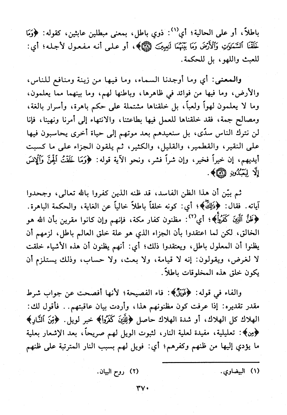 باطلًا، أو على الحالية؛ أي (¬1): ذوي باطل، بمعنى مبطلين عابثين، كقوله: {وَما خَلَقْنَا السَّماواتِ وَالْأَرْضَ وَما بَيْنَهُما لاعِبِينَ (38)}، أو على أنه مفعول لأجله؛ أي: للعبث واللهو، بل للحكمة.
