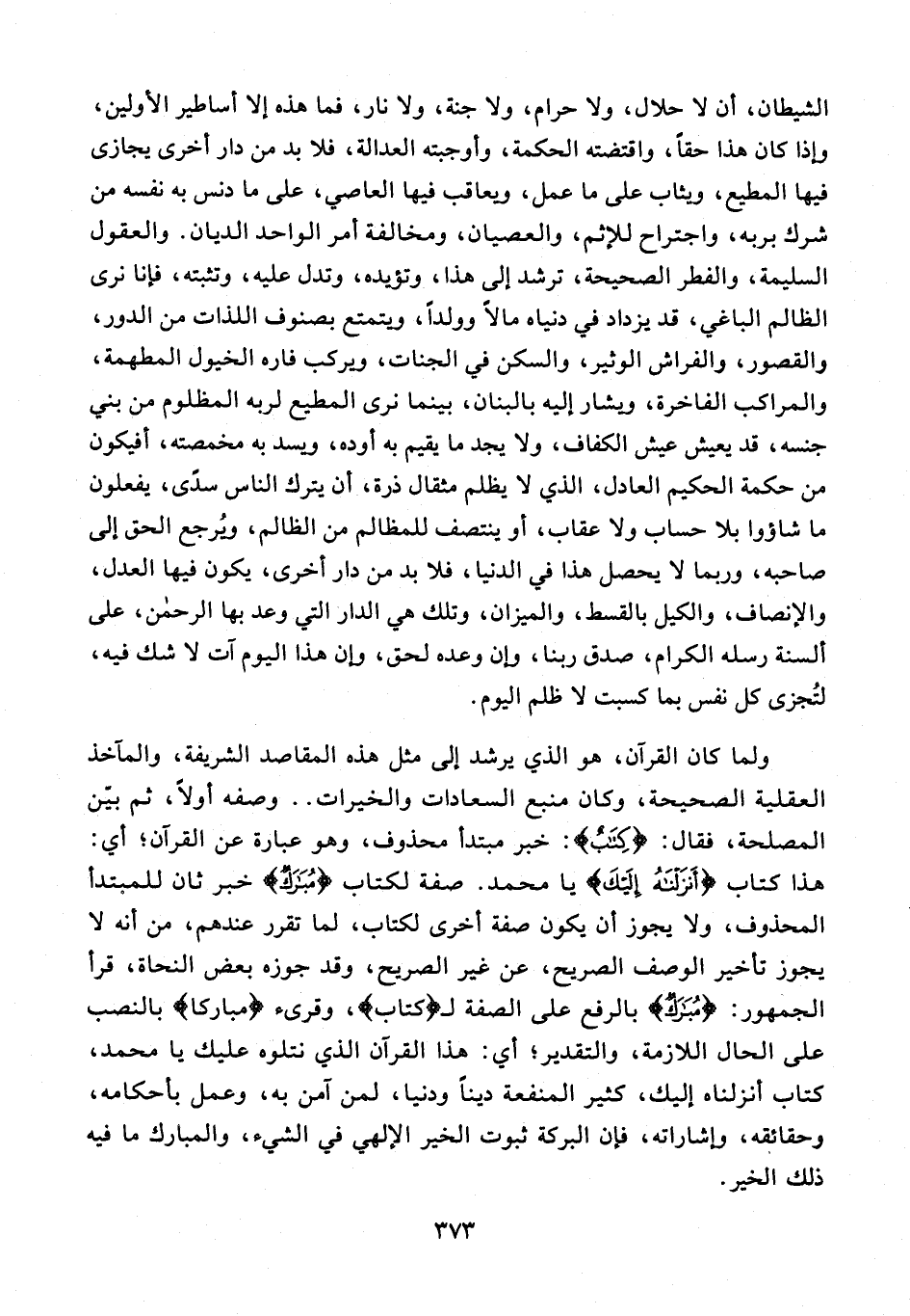 الشيطان، أن لا حلال، ولا حرام، ولا جنة، ولا نار، فما هذه إلا أساطير الأولين، وإذا كان هذا حقا، واقتضته الحكمة، وأوجبته العدالة، فلا بد من دار أخرى يجازى فيها المطيع، ويثاب على ما عمل، ويعاقب فيها العاصي، على ما دنس به نفسه من شرك بربه، واجترح للإثم، والعصيان، ومخالفة أمر الواحد الديان. والعقول السليمة، والفطر الصحيحة، ترشد إلى هذا، وتؤيده، وتدل عليه، وتثبته، فإنا نرى الظالم الباغي، قد يزداد في دنياه مالًا وولدًا، ويتمتع بصنوف اللذات من الدور، والقصور، والفراش الوثير، والسكن في الجنات، ويركب فاره الخيول المطهمة، والمراكب الفاخرة، ويشار إليه بالبنان، بينما نرى المطيع لربه المظلوم من بني جنسه، قد يعيش عيش الكفاف، ولا يجد ما يقيم به أوده، ويسد به مخمصته، أفيكون من حكمة الحكيم العادل، الذي لا يظلم مثقال ذرة، أن يترك الناس سدى، يفعلون ما شاؤوا بلا حساب ولا عقاب، أو ينتصف للمظالم من الظالم، ويرجع الحق إلى صاحبه، وربما لا يحصل هذا في هذا الدنيا، فلا بد من دار أخرى، يكون فيها العدل، والإنصاف، والكيل بالقسط، والميزان، وتلك هي الدار التي وعد بها الرحمن، على ألسنة رسله الكرام، صدق ربنا، وإن وعده لحق، وإن هذا اليوم آت لا شك فيه، لتجزى كل نفس بما كسبت لا ظلم اليوم.
