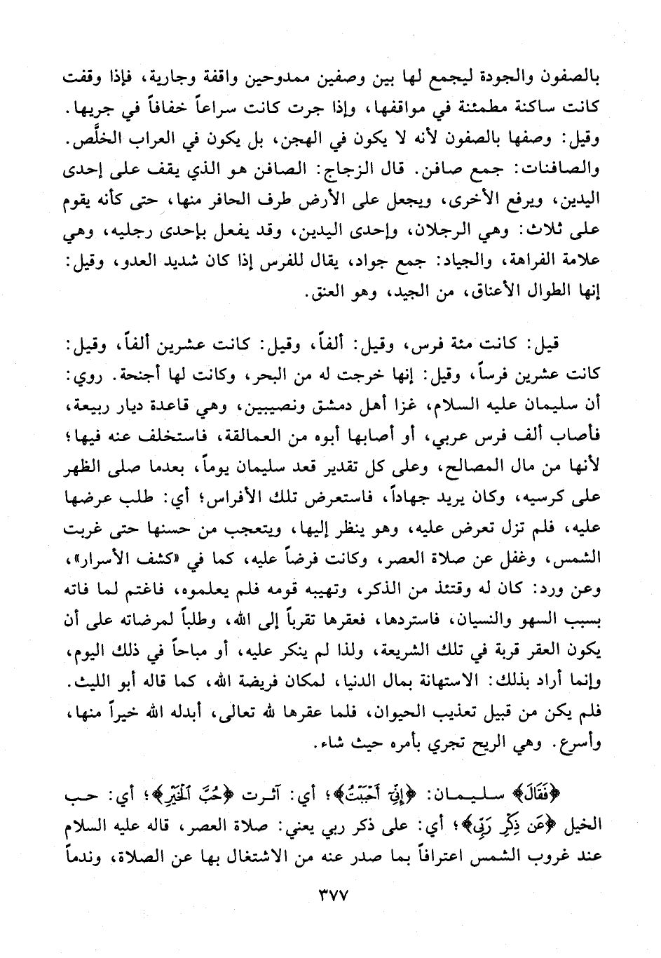 بالصفون والجودة ليجمع لها بين وصفين ممدوحين واقفة وجارية، فإذا وقفت كانت ساكنة مطمئنة في مواقفها، وإذا جرت كانت سراعًا خفافًا في جريها. وقيل: وصفها بالصفون لأنه لا يكون في الهجن، بل يكون في العراب الخلَّص. والصافنات: جمع صافن. قال الزجاج: الصافن هو الذي يقف على إحدى اليدين، ويرفع الأخرى، ويجعل على الأرض طرف الحافر منها، حتى كأنه يقوم على ثلاث: وهي الرجلان، وإحدى اليدين، وقد يفعل بإحدى رجليه، وهي علامة الفراهة، والجياد: جمع جواد، يقال للفرس إذا كان شديد العدو، وقيل: إنها الطوال الأعناق، من الجيد، وهو العنق.