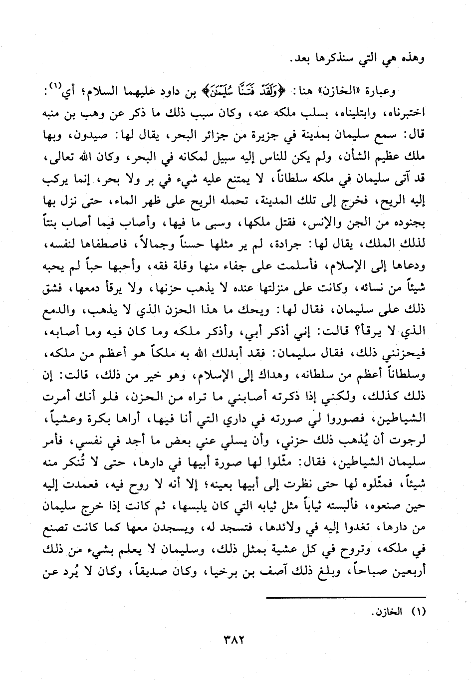 وعبارة «الخازن» هنا: {وَلَقَدْ فَتَنَّا سُلَيْمانَ} بن داود عليهما السلام؛ أي (¬1): اختبرناه، وابتليناه، بسلب ملكه عنه، وكان سبب ذلك ما ذكر عن وهب بن منبه قال: سمع سليمان بمدينة في جزيرة من جزائر البحر، يقال لها: صيدون، وبها ملك عظيم الشأن، ولم يكن للناس إليه سبيل لمكانه في البحر، وكان الله تعالى، قد آتى سليمان في ملكه سلطانًا، لا يمتنع عليه شيء في بر ولا بحر، إنما يركب إليه الريح، فخرج إلى تلك المدينة، تحمله الريح على ظهر الماء، حتى نزل بها بجنوده من الجن والإنس، فقتل ملكها، وسبى ما فيها، وأصاب فيما أصاب بنتا لذلك الملك، يقال لها: جرادة، لم ير مثلها حسنًا وجمالًا، فاصطفاها لنفسه، ودعاها إلى الإسلام، فأسلمت على جفاء منها وقلة فقه، وأحبها حبًا لم يحبه شيئًا من نسائه، وكانت على منزلتها عنده لا يذهب حزنها، ولا يرقأ دمعها، فشق ذلك على سليمان، فقال لها: ويحك ما هذا الحزن الذي لا يذهب، والدمع الذي لا يرقأ؟ قالت: إني أذكر أبي، وأذكر ملكه وما كان فيه وما أصابه، فيحزنني ذلك، فقال سليمان: فقد أبدلك الله به ملكا هو أعظم من ملكه، وسلطانًا أعظم من سلطانه، وهداك إلى الإسلام، وهو خير من ذلك، قالت: إن ذلك كذلك، ولكني إذا ذكرته أصابني ما تراه من الحزن، فلو أنك أمرت الشياطين، فصوروا لي صورته في داري التي أنا فيها، أراها بكرة وعشيًا، لرجوت أن يذهب ذلك حزني، وأن يسلي عني بعض ما أجد في نفسي، فأمر سليمان الشياطين، فقال: مثّلوا لها صورة أبيها في دارها، حتى لا تنكر منه شيئًا، فمثّلوه لها حتى نظرت إلى أبيها بعينه؛ إلا أنه لا روح فيه، فعمدت إليه حين صنعوه، فألبسته ثيابًا مثل ثيابه التي كان يلبسها، ثم كانت إذا خرج سليمان من دارها، تغدوا إليه في ولائدها، فتسجد له، ويسجدن معها كما كانت تصنع في ملكه، وتروح في كل عشية بمثل ذلك، وسليمان لا يعلم بشيء من ذلك أربعين صباحًا، وبلغ ذلك آصف بن برخيا، وكان صديقًا، وكان لا يرد عن