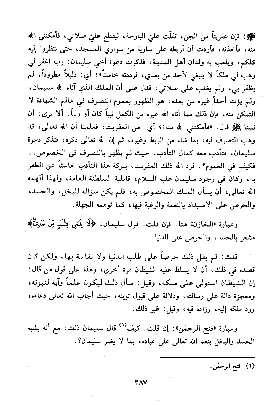 - صلى الله عليه وسلم -: «إن عفريتًا من الجن، تفلّت عليّ البارحة، ليقطع عليّ صلاتي، فأمكنني الله منه، فأخذته، فأردت أن أربطه على سارية من سواري المسجد، حتى تنظروا إليه كلكم، ويلعب به ولدان أهل المدينة، فذكرت دعوة أخي سليمان: رب اغفر لي وهب لي ملكًا لا ينبغي لأحد من بعدي، فرددته خاسئًا»؛ أي: ذليلا مطرودا، لم يظفر بي، ولم يغلب على صلاتي، فدل على أن الملك الذي آتاه الله سليمان، ولم يؤت أحدًا غيره من بعده، هو الظهور بعموم التصرف في عالم الشهادة لا التمكن منه، فإن ذلك مما آتاه الله غيره من الكمل نبيا كان أو وليا. ألا ترى: أن نبينا - صلى الله عليه وسلم - قال: «فأمكنني الله منه»؛ أي: من العفريت، فعلمنا أن الله تعالى، قد وهب التصرف فيه، بما شاء من الربط وغيره، ثم إن الله تعالى ذكره، فتذكر دعوة سليمان، فتأدب معه كمال التأدب، حيث لم يظهر بالتصرف في الخصوص .. فكيف في العموم؟. فرد الله ذلك العفريت، ببركة هذا التأدب خاسئًا عن الظفر به، وكان في وجود سليمان عليه السلام، قابلية السلطنة العامة، ولهذا ألهمه الله تعالى، أن يسأل الملك المخصوص به، فلم يكن سؤاله للبخل، والحسد، والحرص على الاستبداد بالنعمة والرغبة فيها، كما توهمه الجهلة.