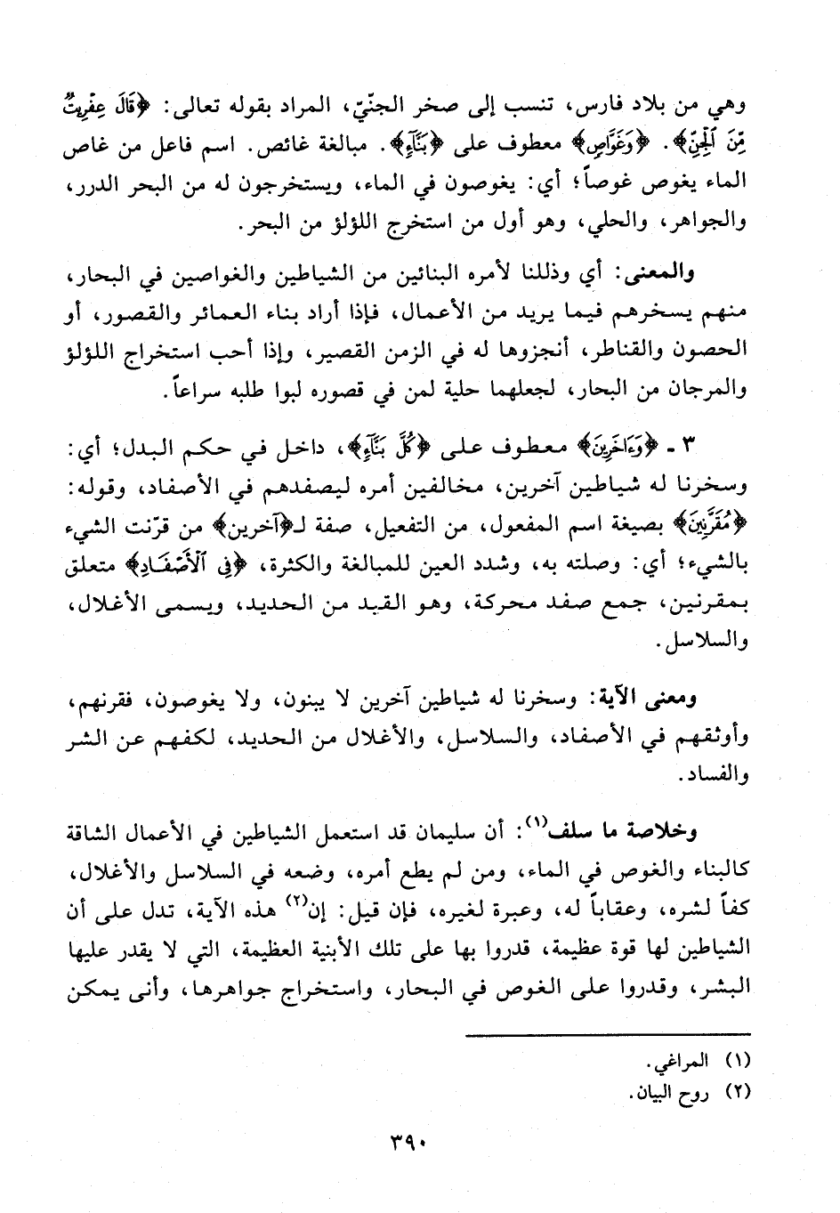 والمعنى: أي وذللنا لأمره البنائين من الشياطين والغواصين في البحار، منهم يسخرهم فيما يريد من الأعمال، فإذا أراد بناء العمائر والقصور، أو الحصون والقناطر، أنجزوها له في الزمن القصير، وإذا أحب استخراج اللؤلؤ والمرجان من البحار، لجعلهما حلية لمن في قصورة لبوا طلبه سراعًا.