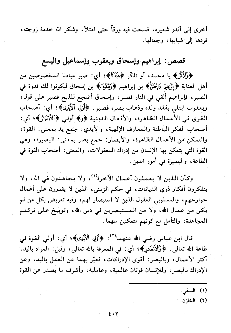 45 - {وَاذْكُرْ} يا محمد، أو تذكّر {عِبادَنا}؛ أي: صبر عبادنا المخصوصين من أهل العناية {إِبْراهِيمَ وَإِسْحاقَ} بن إبراهيم {وَيَعْقُوبَ} بن إسحاق ليكونوا لك قدوة في الصبر، فإبراهيم ألقي في النار فصبر، وإسحاق أضجع للذبح فصبر على قول، ويعقوب ابتلي بفقد ولده وذهاب بصره فصبر. {أُولِي الْأَيْدِي}؛ أي: أصحاب القوى في الأعمال الظاهرة، والأفعال الدينية {وَ} أولي {الْأَبْصارِ}؛ أي: أصحاب الفكر الباطنة والمعارف الإلهية، والأيدي: جمع يد بمعنى: القوة، والتمكن من الأعمال الظاهرة، والأبصار: جمع بصر بمعنى: البصيرة، وهي القوة التي يتمكن بها الإنسان من إدراك المعقولات، والمعنى: أصحاب القوة في الطاعة، والبصيرة في أمور الدين.