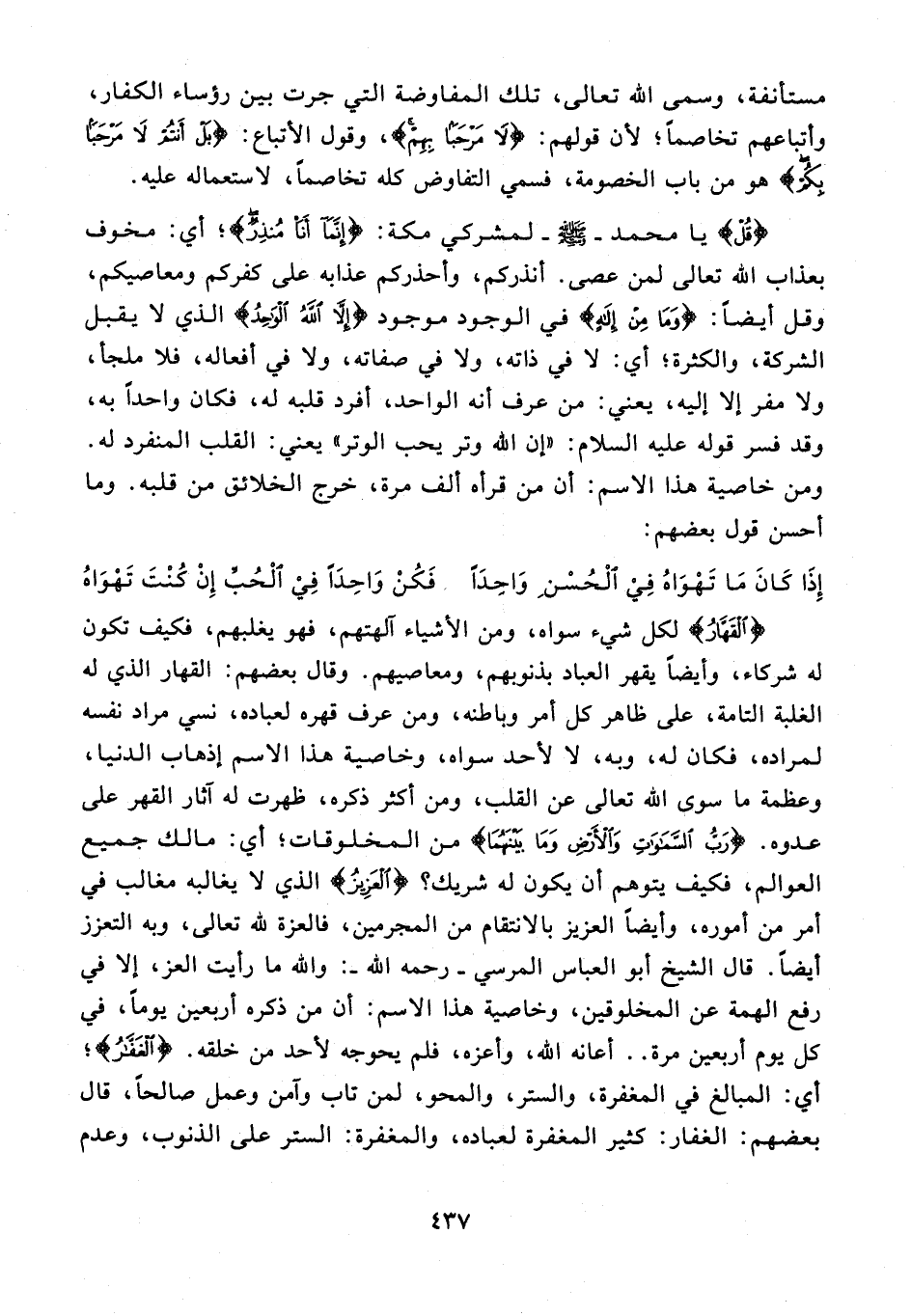 {الْقَهَّارُ} لكل شيء سواه، ومن الأشياء آلهتهم، فهو يغلبهم، فكيف تكون له شركاء، وأيضًا يقهر العباد بذنوبهم، ومعاصيهم. وقال بعضهم: القهار الذي له الغلبة التامة، على ظاهر كل أمر وباطنه، ومن عرف قهره لعباده، نسي مراد نفسه لمراده، فكان له، وبه، لا لأحد سواه، وخاصية هذا الاسم إذهاب الدنيا، وعظمة ما سوى الله تعالى عن القلب، ومن أكثر ذكره، ظهرت له آثار القهر على عدوه.