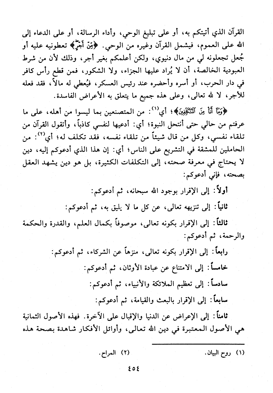 ثامنًا: إلى الإعراض عن الدنيا والإقبال على الآخرة. فهذه الأصول الثمانية هي الأصول المعتبرة في دين الله تعالى، وأوائل الأفكار شاهدة بصحة هذه
