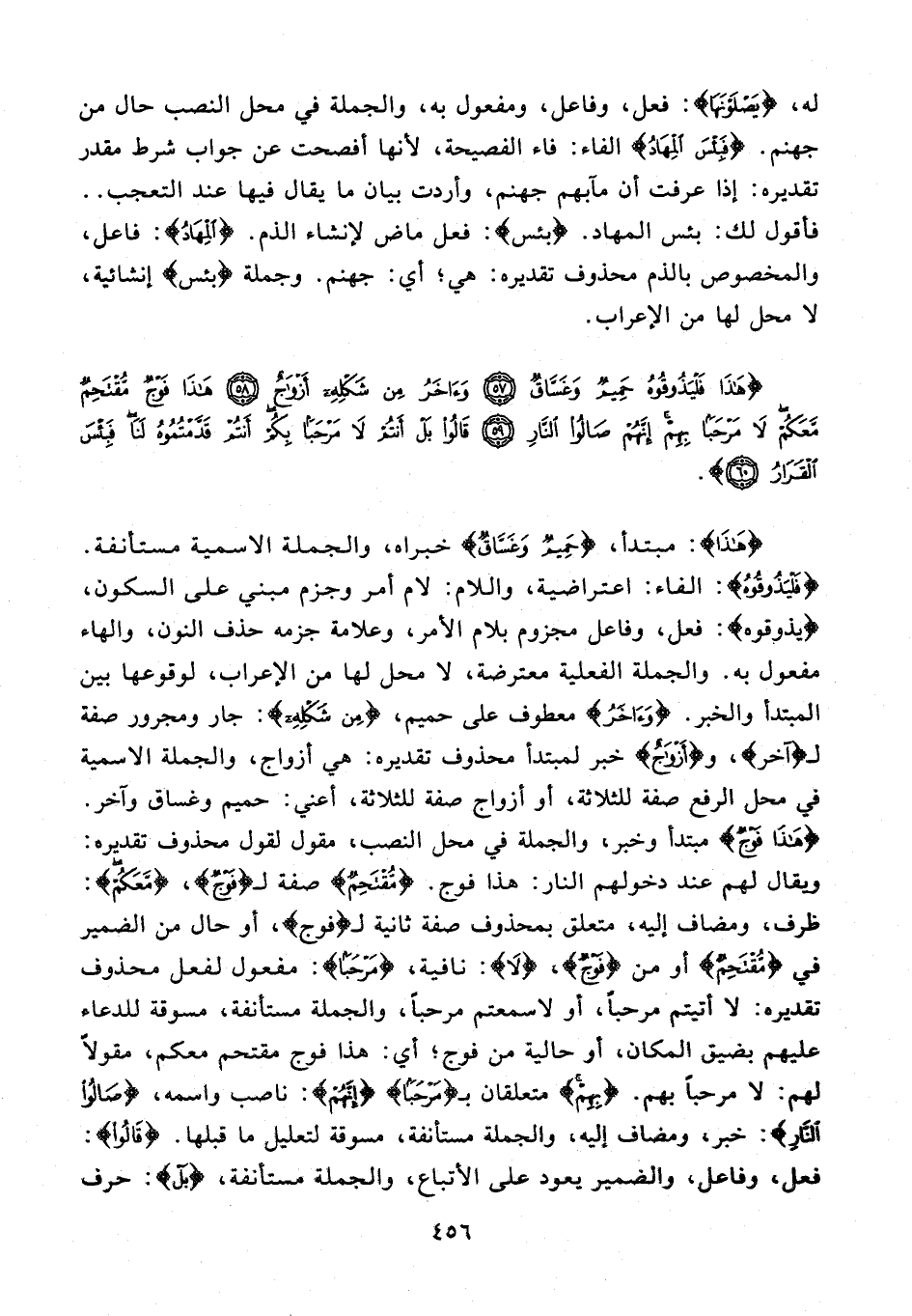 {هذا}: مبتدأ، {حَمِيمٌ وَغَسَّاقٌ} خبراه، والجملة الاسمية مستأنفة. {فَلْيَذُوقُوهُ}: الفاء: اعتراضية، واللام: لام أمر وجزم مبني على السكون، {يذوقوه}: فعل، وفاعل مجزوم بلام الأمر، وعلامة جزمه حذف النون، والهاء مفعول به. والجملة الفعلية معترضة، لا محل لها من الإعراب، لوقوعها بين المبتدأ والخبر. {وَآخَرُ} معطوف على حميم، {مِنْ شَكْلِهِ}: جار ومجرور صفة لـ {آخَرُ}، و {أَزْواجٌ} خبر لمبتدأ محذوف تقديره: هي أزواج، والجملة الاسمية في محل الرفع صفة للثلاثة، أو أزواج صفة للثلاثة، أعني: حميم وغساق وآخر. {هذا فَوْجٌ} مبتدأ وخبر، والجملة في محل النصب، مقول لقول محذوف تقديره: ويقال لهم عند دخولهم النار: هذا فوج. {مُقْتَحِمٌ} صفة لـ {فَوْجٌ}، {مَعَكُمْ}: ظرف، ومضاف إليه، متعلق بمحذوف صفة ثانية لـ {فَوْجٌ}، أو حال من الضمير في {مُقْتَحِمٌ} أو من {فَوْجٌ}، {لا}: نافية، {مَرْحَبًا}: مفعول لفعل محذوف تقديره: لا أتيتم مرحبًا، أو لا سمعتم مرحبًا، والجملة مستأنفة، مسوقة للدعاء عليهم بضيق المكان، أو حالية من فوج؛ أي: هذا فوج مقتحم معكم، مقولًا لهم: لا مرحبًا بهم. {بِهِمْ} متعلقان بـ {مَرْحَبًا} {إِنَّهُمْ}: ناصب واسمه، {صالُوا النَّارِ}: خبر، ومضاف إليه، والجملة مستأنفة، مسوقة لتعليل ما قبلها. {قالُوا}: فعل، وفاعل، والضمير يعود على الأتباع، والجملة مستأنفة، {بَلْ}: حرف
