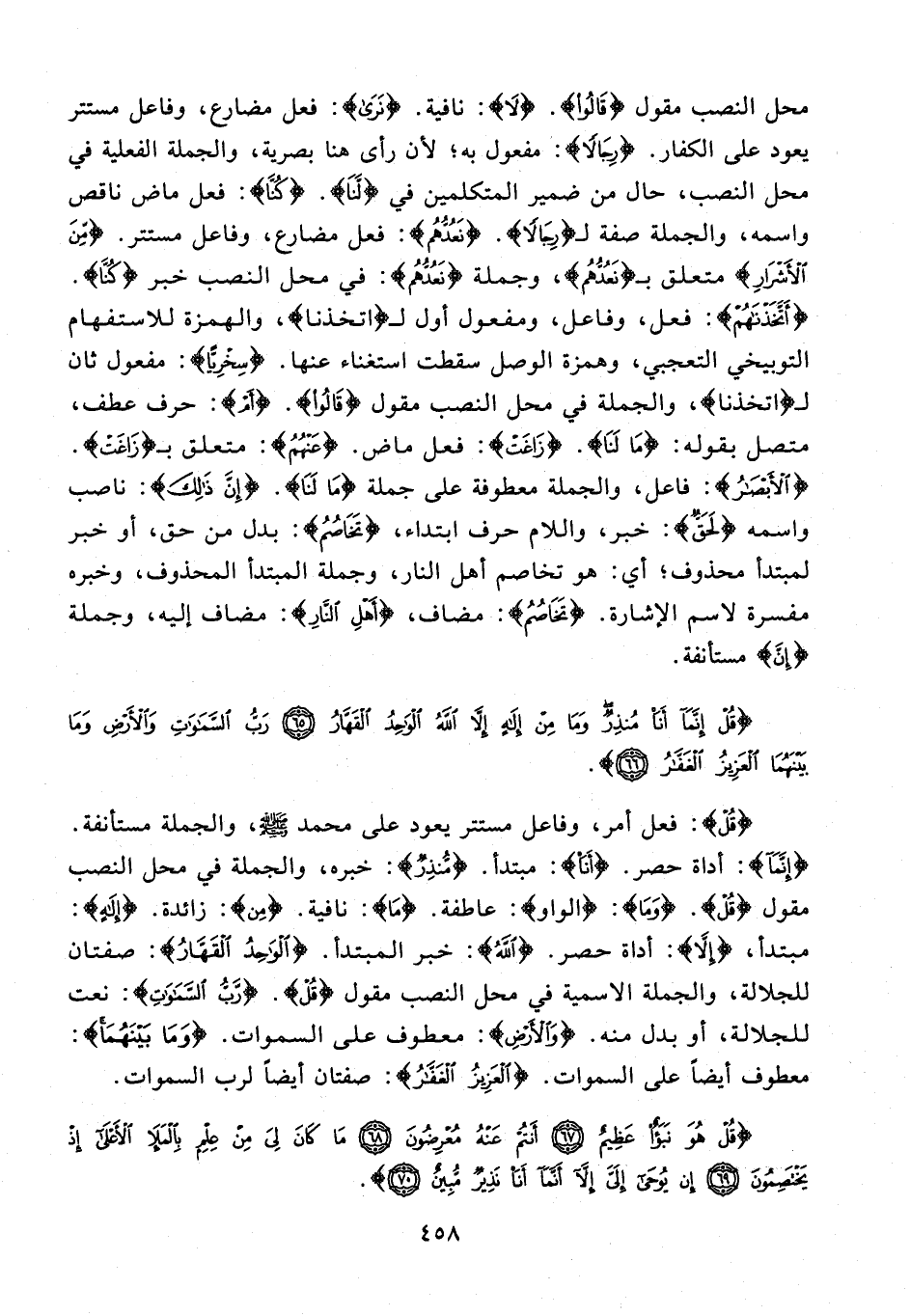 {قُلْ}: فعل أمر، وفاعل مستتر يعود على محمد - صلى الله عليه وسلم -، والجملة مستأنفة. {إِنَّما}: أداة حصر. {أَنَا}: مبتدأ. {مُنْذِرٌ}: خبره، والجملة في محل النصب مقول {قُلْ}. {وَما}: {الواو}: عاطفة. {ما}: نافية. {مِنْ}: زائدة. {إِلهٍ}: مبتدأ، {إِلَّا}: أداة حصر. {اللَّهُ}: خبر المبتدأ. {الْواحِدُ الْقَهَّارُ}: صفتان للجلالة، والجملة الاسمية في محل النصب مقول {قُلْ}. {رَبُّ السَّماواتِ}: نعت للجلالة، أو بدل منه. {وَالْأَرْضِ}: معطوف على السموات. {وَما بَيْنَهُمَا}: معطوف أيضًا على السموات. {الْعَزِيزُ الْغَفَّارُ}: صفتان أيضًا لرب السموات.