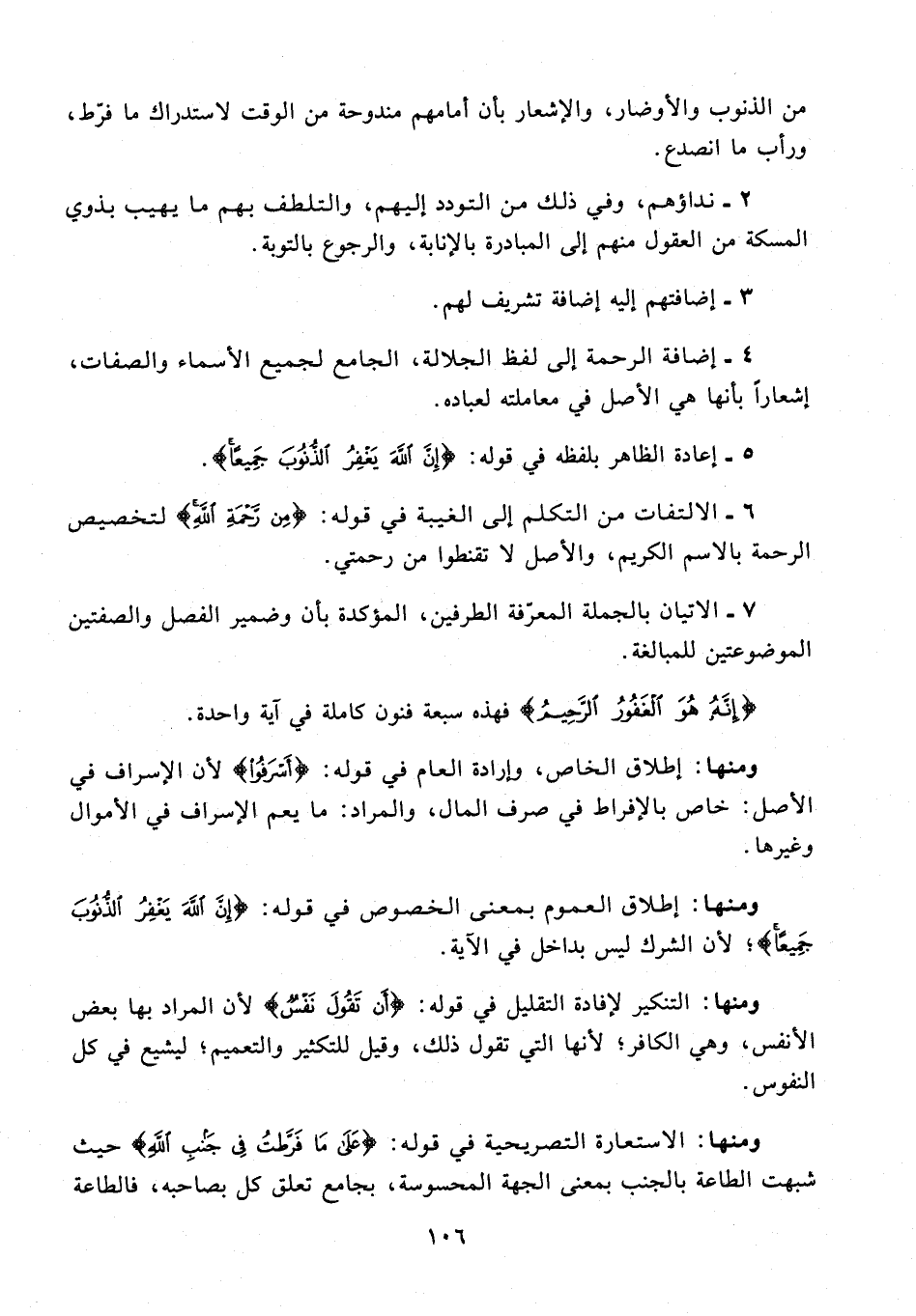 ومنها: إطلاق العموم بمعنى الخصوص في قوله: {إِنَّ اللَّهَ يَغْفِرُ الذُّنُوبَ جَمِيعًا}؛ لأن الشرك ليس بداخل في الآية.