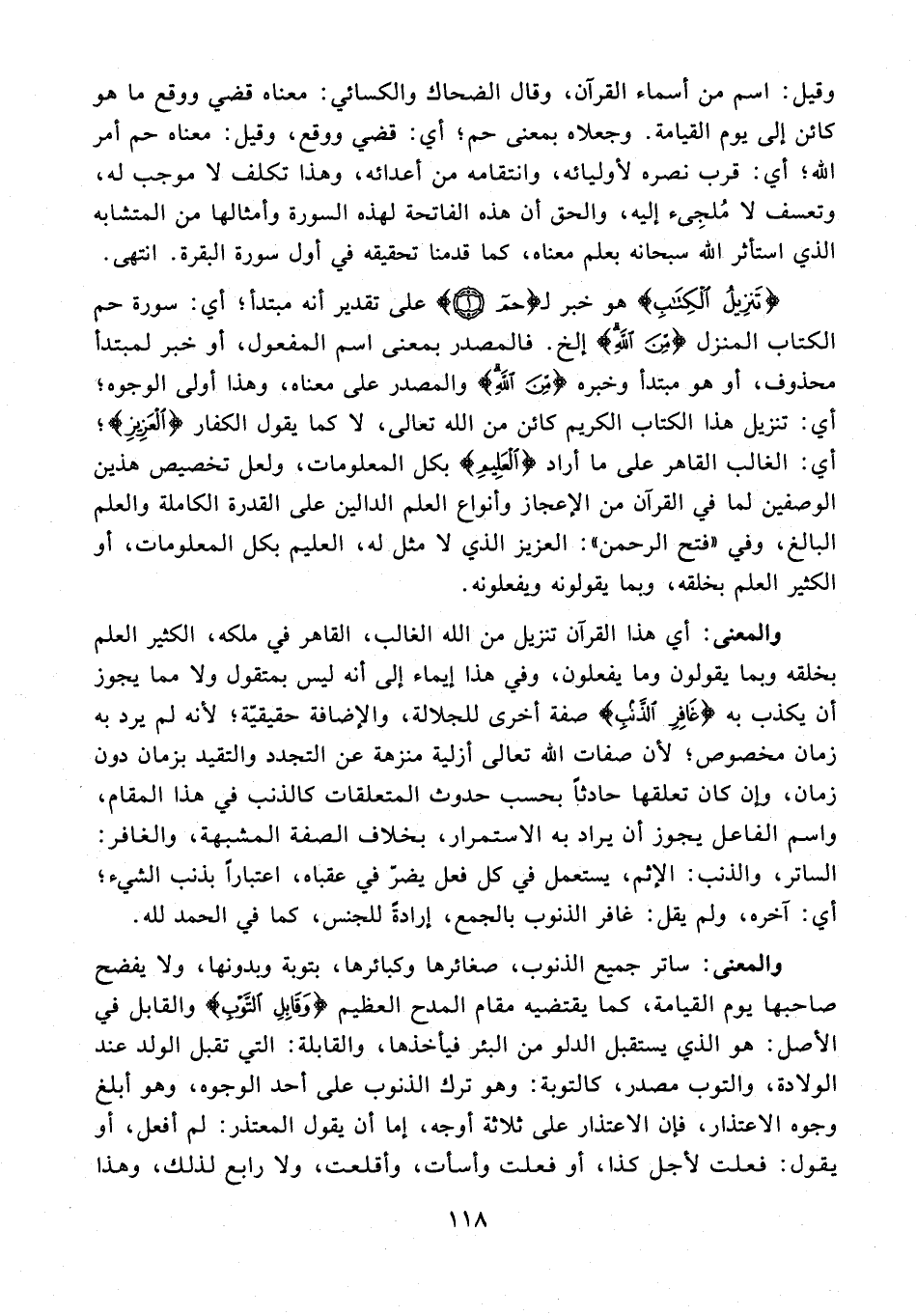 3 - {غَافِرِ الذَّنْبِ} صفة أخرى للجلالة، والإضافة حقيقيّة؛ لأنه لم يرد به زمان مخصوص؛ لأن صفات الله تعالى أزلية منزهة عن التجدد والتقيد بزمان دون زمان، وإن كان تعلقها حادثًا بحسب حدوث المتعلقات كالذنب في هذا المقام، واسم الفاعل يجوز أن يراد به الاستمرار، بخلاف الصفة المشبهة، والغافر: الساتر، والذنب: الإثم، يستعمل في كل فعل يضرّ في عقباه، اعتبارًا بذنب الشيء؛ أي: آخره، ولم يقل: غافر الذنوب بالجمع، إرادةً للجنس، كما في الحمد لله.