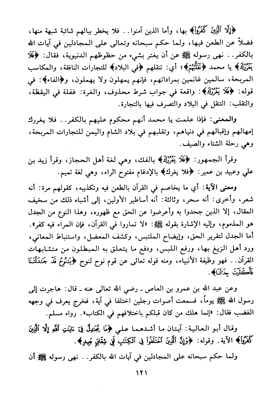 ومعنى الآية: أي ما يخاصم في القرآن بالطعن فيه وتكذيبه، كقولهم مرة: أنه شعر، وأخرى: أنه سحر، وثالثة: أنه أساطير الأولين، إلى أشباه ذلك من سخيف المقال، إلا الذين جحدوا به وأعرضوا عن الحق مع ظهوره، وهذا النوع من الجدل هو المذموم، وإليه الإشارة بقوله - صلى الله عليه وسلم -: "لا تماروا في القرآن، فإن المراء فيه كفر". أما الجدل لتقرير الحق، وإيضاح الملتبس، وكشف المعضل، واستنباط المعاني، ورد أهل الزيغ بها، ورفع اللبس، ودفع ما يتعلق به المبطلون من متشابهات القرآن .. فهو وظيفة الأنبياء، ومنه قوله تعالى عن قوم نوح لنوح {يَا نُوحُ قَدْ جَادَلْتَنَا فَأَكْثَرْتَ جِدَالَنَا}.