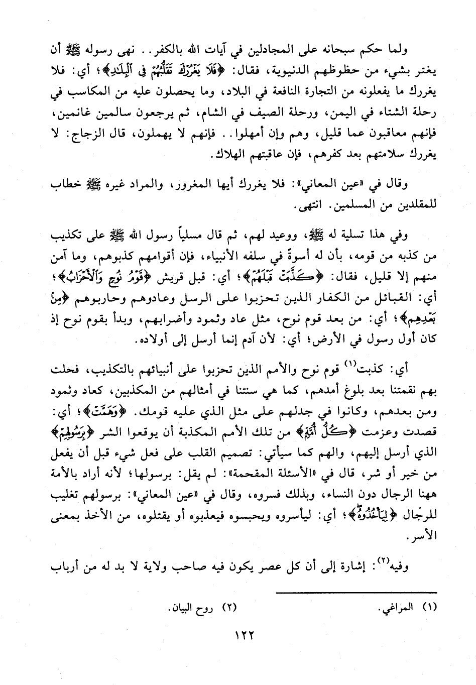ولما حكم سبحانه على المجادلين في آيات الله بالكفر .. نهى رسوله - صلى الله عليه وسلم - أن يغتر بشيء من حظوظهم الدنيوية، فقال: {فَلَا يَغْرُرْكَ تَقَلُّبُهُمْ فِي الْبِلَادِ}؛ أي: فلا يغررك ما يفعلونه من التجارة النافعة في البلاد، وما يحصلون عليه من المكاسب في رحلة الشتاء في اليمن، ورحلة الصيف في الشام، ثم يرجعون سالمين غانمين، فإنهم معاقبون عما قليل، وهم وإن أمهلوا .. فإنهم لا يهملون، قال الزجاج: لا يغررك سلامتهم بعد كفرهم، فإن عاقبتهم الهلاك.